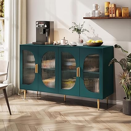 AERPOWER Sideboard Buffet Cabinet with 4 Glass Doors, Wood Accent Cabinet with Storage Shelves, Green Credenza Display Cabinet, Modern Storage Cabinet for Kitchen, Dining Room, Living Room, Hallway
