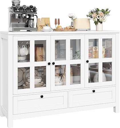Keyluv Buffet Cabinet Wood/Glass Sideboard Storage Cabinet with 3 Doors and 2 Drawers, 47.2 inches Kitchen Buffet Table for Dining Room, Living Room, Entryway, White