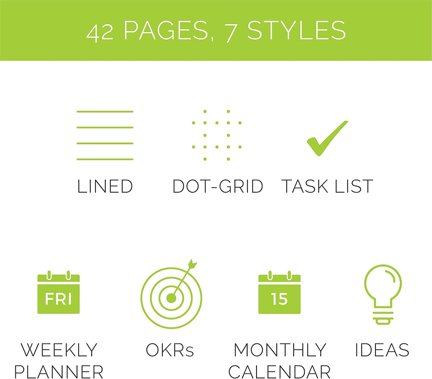 • No more wasting paper - this environmentally friendly 42 page notebook has 7 different page styles for planning, listing, goal setting, note-taking, sketching, and sharing big ideas
