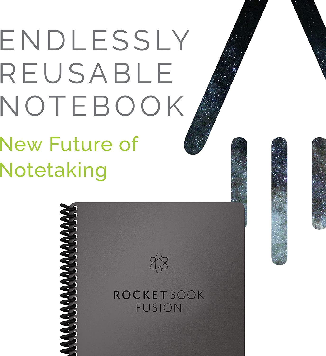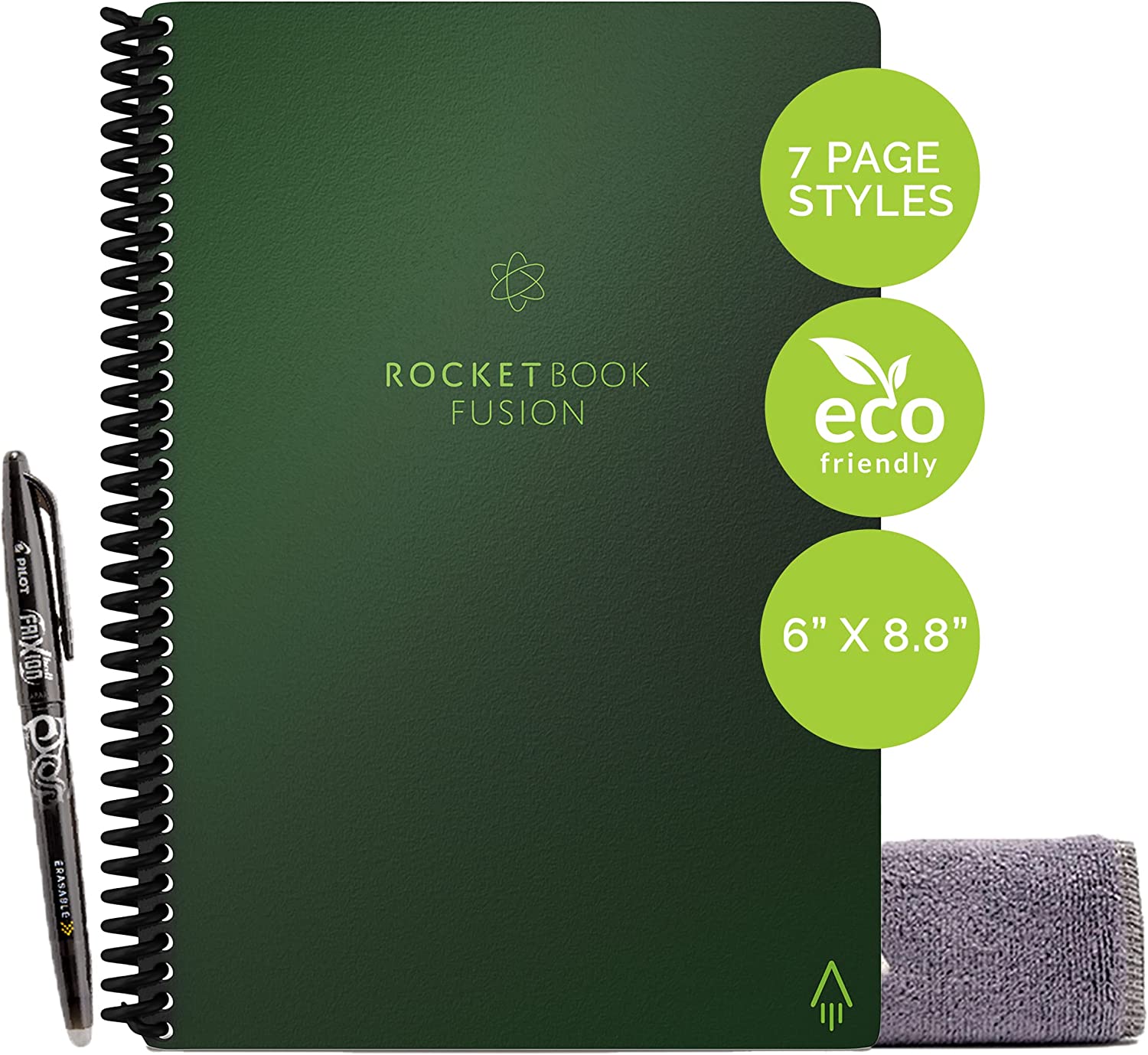 The Rocketbook Fusion is designed for every classroom, office, and personal mission. The Fusion is a reusable pen and paper notebook with seven different page templates that connect to your favorite cloud services. 42 futuristic pages are packed with calendars, to-do lists, and notetaking layouts. And of course the Fusion is made with patented reusable Core technology. The synthetic paper allows you to write smoothly with a Pilot FriXion pen, then magically wipe clean with a damp cloth to reuse again and again! Use the Rocketbook app to blast your notes, plans, lists, and big ideas to the cloud for proper organization. Then, erase and reuse your Fusion for your next adventure!