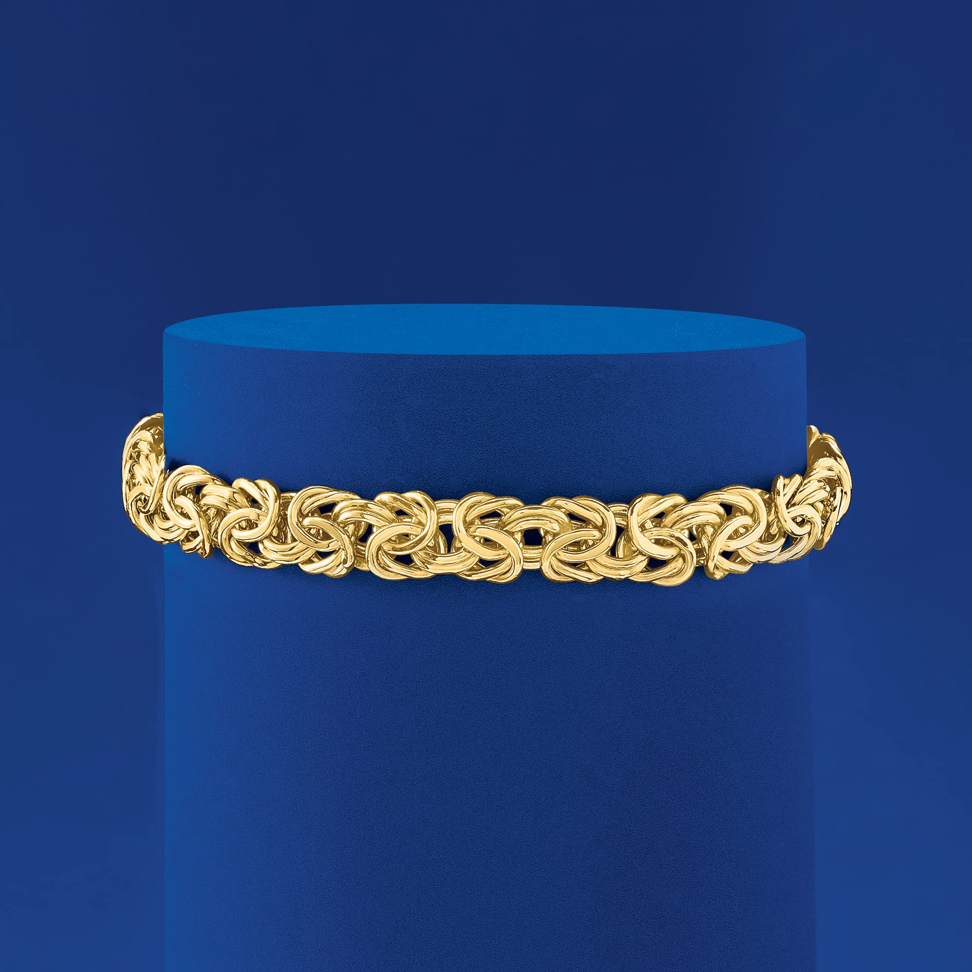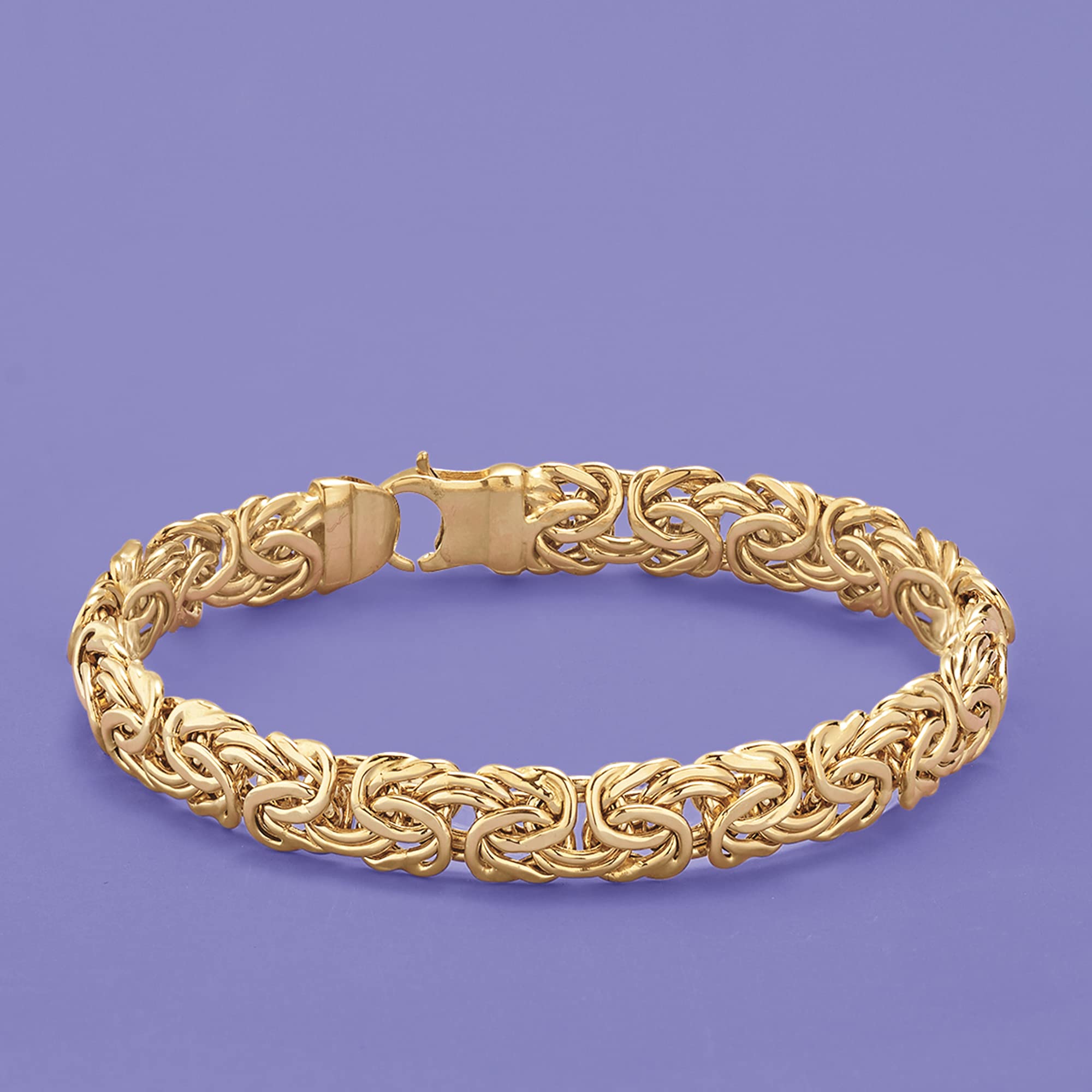Details: Ross-Simons is the authority on luxury classics. An all-time favorite, this woven Byzantine bracelet is composed of perfectly polished 14kt yellow gold. Woven links are sophisticated and sumptuous, making this an absolute wardrobe essential. Approx. 1/4" wide. Lobster clasp, 14kt yellow gold Byzantine bracelet.