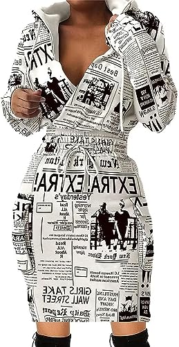 BIRW Size M White Newspaper Print Hoodie Dress for Women 2024 Slim Casual Long Sleeve High Waist Drawstring Pullover Bodycon Sweatshirt Dresses with Pockets