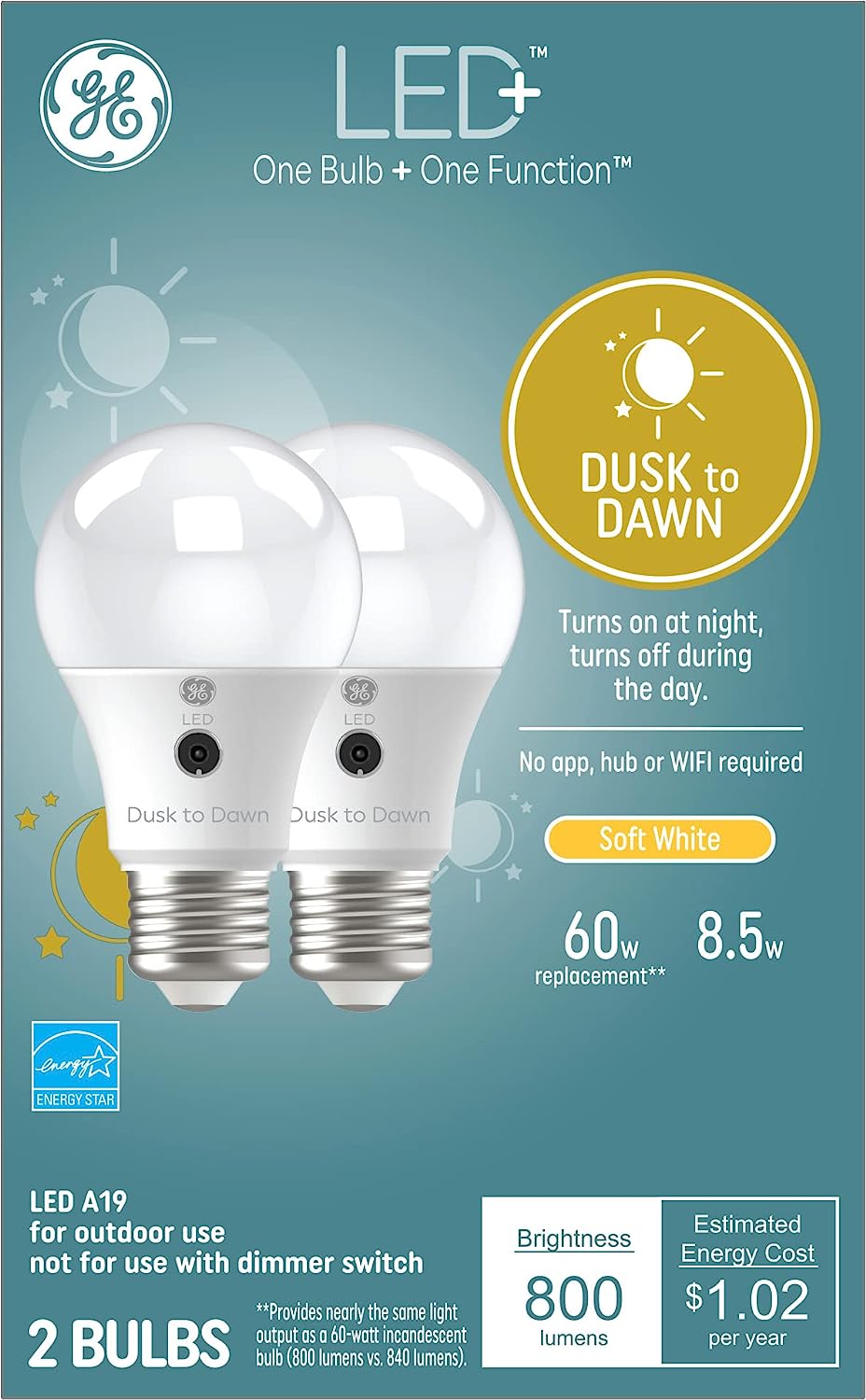 Stay bright when the sun goes down. Light + Dusk to Dawn. This simple LED is up all night, so you can rest. With a built-in light sensor, this long lasting and energy efficient bulb automatically illuminates to brighten the night. Add to any outdoor fixture for an easy sense of security. Simply screw in this LED bulb to get. Automatic on/off light control from Dusk to Dawn. Simple built-in sensor detects ambient light. Upgrade your home with sunlight sensor light bulbs. The LED+ Dusk to Dawn light bulbs (outdoor) are the perfect upgrade for your fixtures that automatically turn on and off with daylight. Energy efficient LED lights. The Dusk to Dawn light bulbs (outdoor) perfectly replace your outdoor 60 watt light bulbs and were designed to use only 8 watts, extending the life of your sunlight sensor lights and reducing your energy costs. Automatic Dusk to Dawn LED outdoor lighting: These LED light bulbs feature a simple, built-in sensor that detects ambient light to calculate when to power on and off with no scheduling required. Outdoor light bulbs (60-Watt equivalent): Get the efficiency of low wattage light bulbs. The Dusk to Dawn light bulbs are the easiest way to cut costs without sacrificing brightness or automated functionality. LED lights that keep things bright: The Dusk to Dawn LED outdoor lighting will automatically turn on when it gets dark, giving off the appearance that someone is always home.