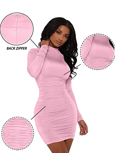 GOKATOSAU Women's Sexy Stand Neck Bodycon Long Sleeve Ruched Culb Party Mini Dress Pink