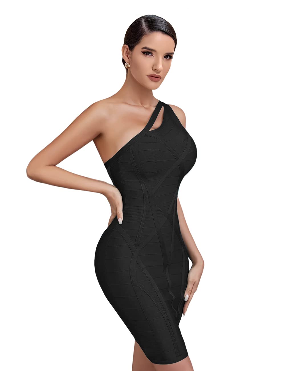 whoinshop Women's One Shoulder Cut Out Bodycon Dress Strappy Evening Party Club Bandage Dress Black S