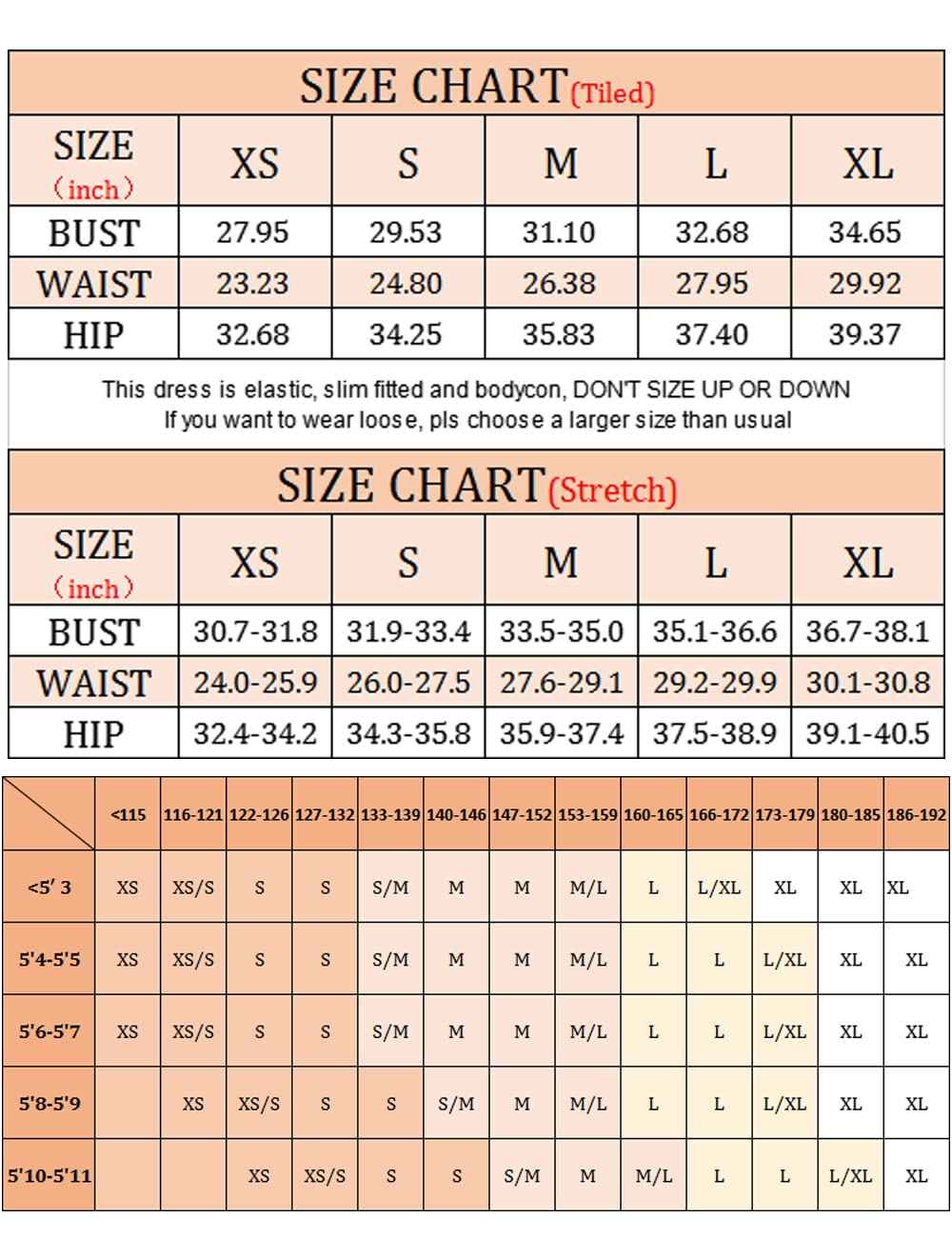 • Size:Bandage fabrics always make you feel tight,DON'T SIZE UP OR DOWN!Choose One Size Bigger If You Not Love Tight,pls refer to our size information before you ordering this bandage dress