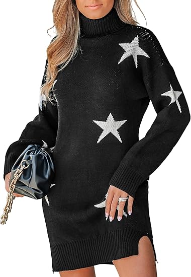 CUPSHE Women's Sweater Dress High Neck Star Print Long Sleeve Ribbed Trim Casual Pullover Dresses