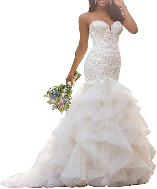 Long Mermaid Wedding Dress with Ruffle Skirt Elegant Lace Appliques Sweetheart Wedding Gown