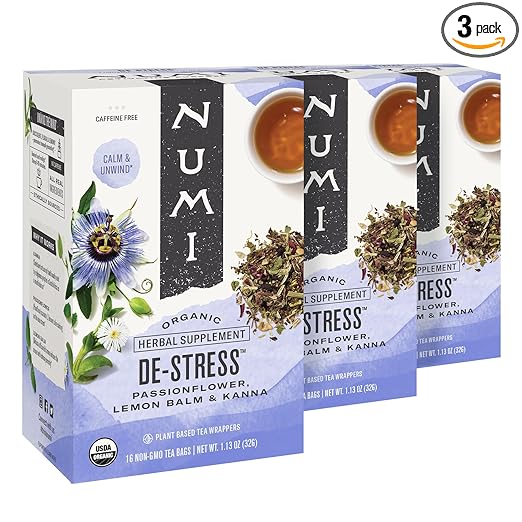 Numi Organic De-Stress Tea, 16 Tea Bags (Pack of 3), Passionflower, Lemon Balm, and Kanna, Caffeine Free
