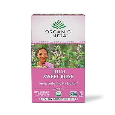 ORGANIC INDIA Tulsi Sweet Rose Herbal Tea - Holy Basil Leaf, African Basil, Chamomilie, Lemon Myrtle, Stress Relieving, Immune Support, USDA Certified Organic, Caffeine-Free - 18 Infusion Bags, 1 Pack