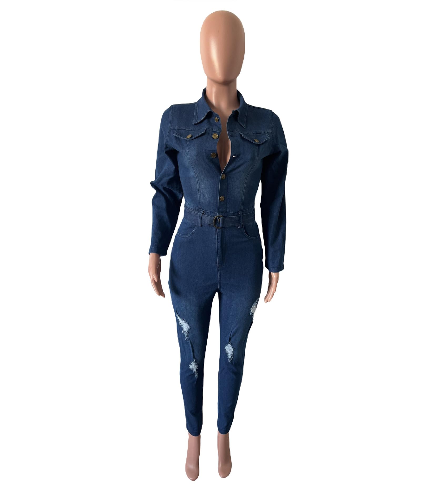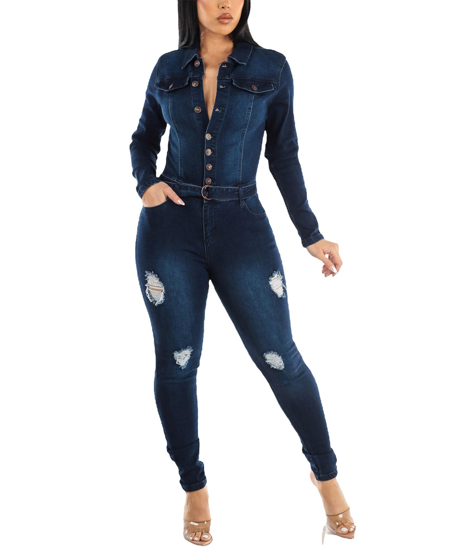 • ★Features☆★ Denim Jumpsuits,Lapel Collar,Sexy Button Down Front,Long Sleeve,Skinning Jeans Pants, Destroyed,Distressed,Ripped Hole,Belted Waist,Full Length,Pockets,Long One Piece Jumpsuit Playsuit,Slim Fit