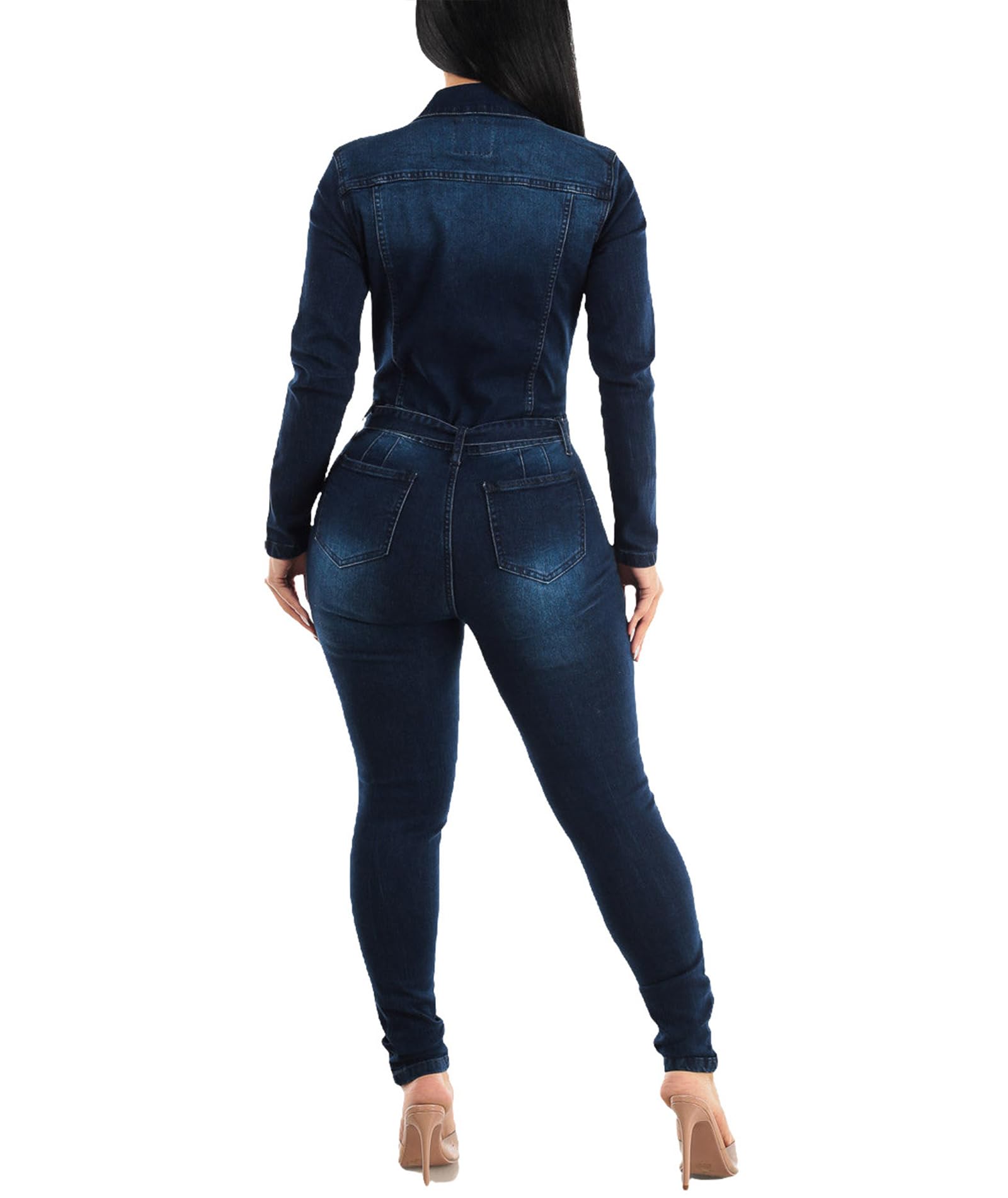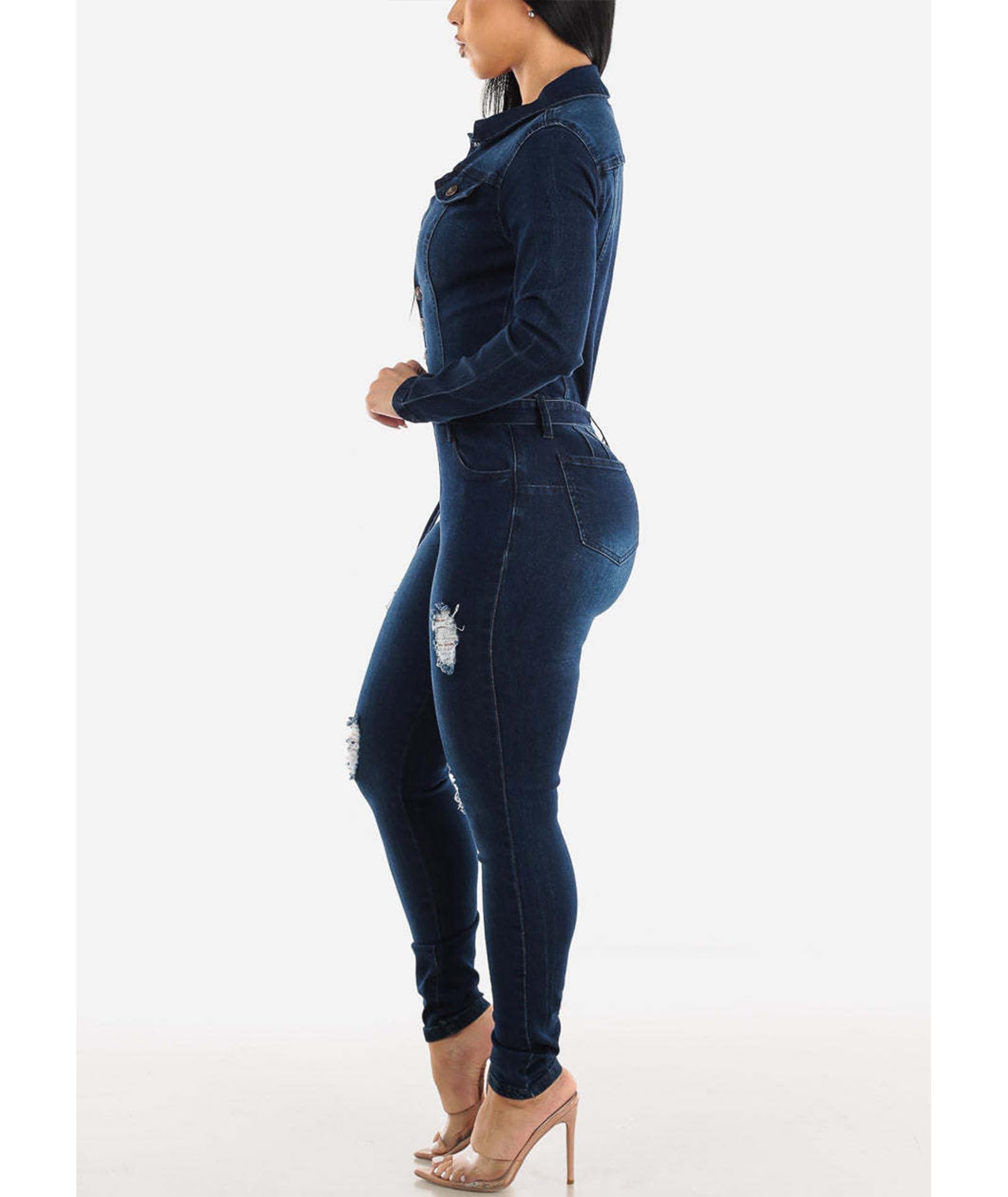 Sexyshine Women's Button Down Slim Fit Denim Jumpsuit Lapel Long Sleeve Bodycon Full Length Ripped Jeans Rompers Overalls(26158BE,M)
