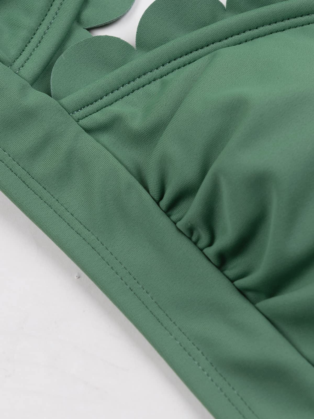 CUPSHE Women Scalloped V Neck Bikini Swimsuit High Waist Floral Ruched Two Piece Bathing Suit, L Green