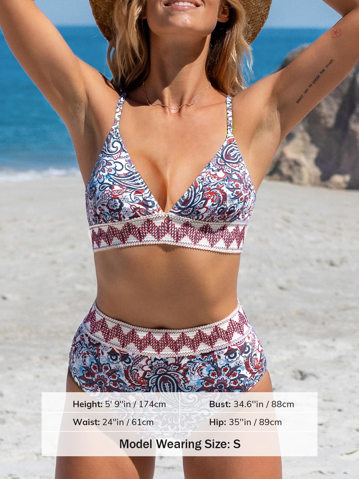 • Design: The Stylish Two Piece Swimsuit Features Deep V Neck and Adjustable Spaghetti Straps Design Can Make You Flattering. High Waisted Bottom with Classic Coverage can Better Modify your Leg Shape. Textured Fabric and Boho Sewing are Unique. About Cup Style: With Removable Soft Cups.