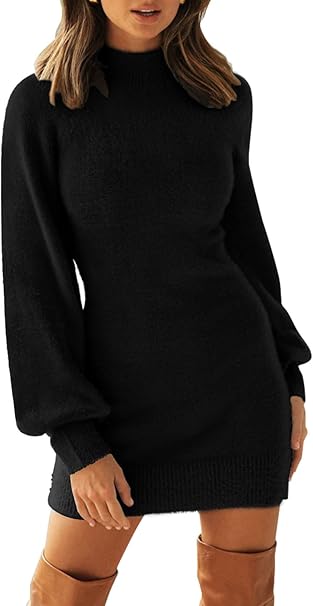 ZESICA Women's 2024 Casual Turtleneck Long Puff Sleeve Soft Fuzzy Knit Bodycon Pullover Mini Sweater Dress