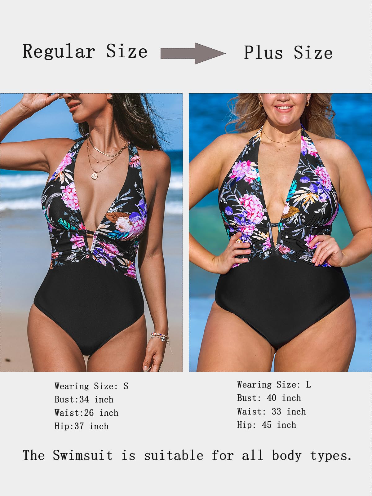 • Design: This one piece swimsuit features a stylish combination of a deep v neck design, halter back tie for a flattering fit, and eye-catching floral print, making it a perfect blend of fashion and comfort for the beach or pool.