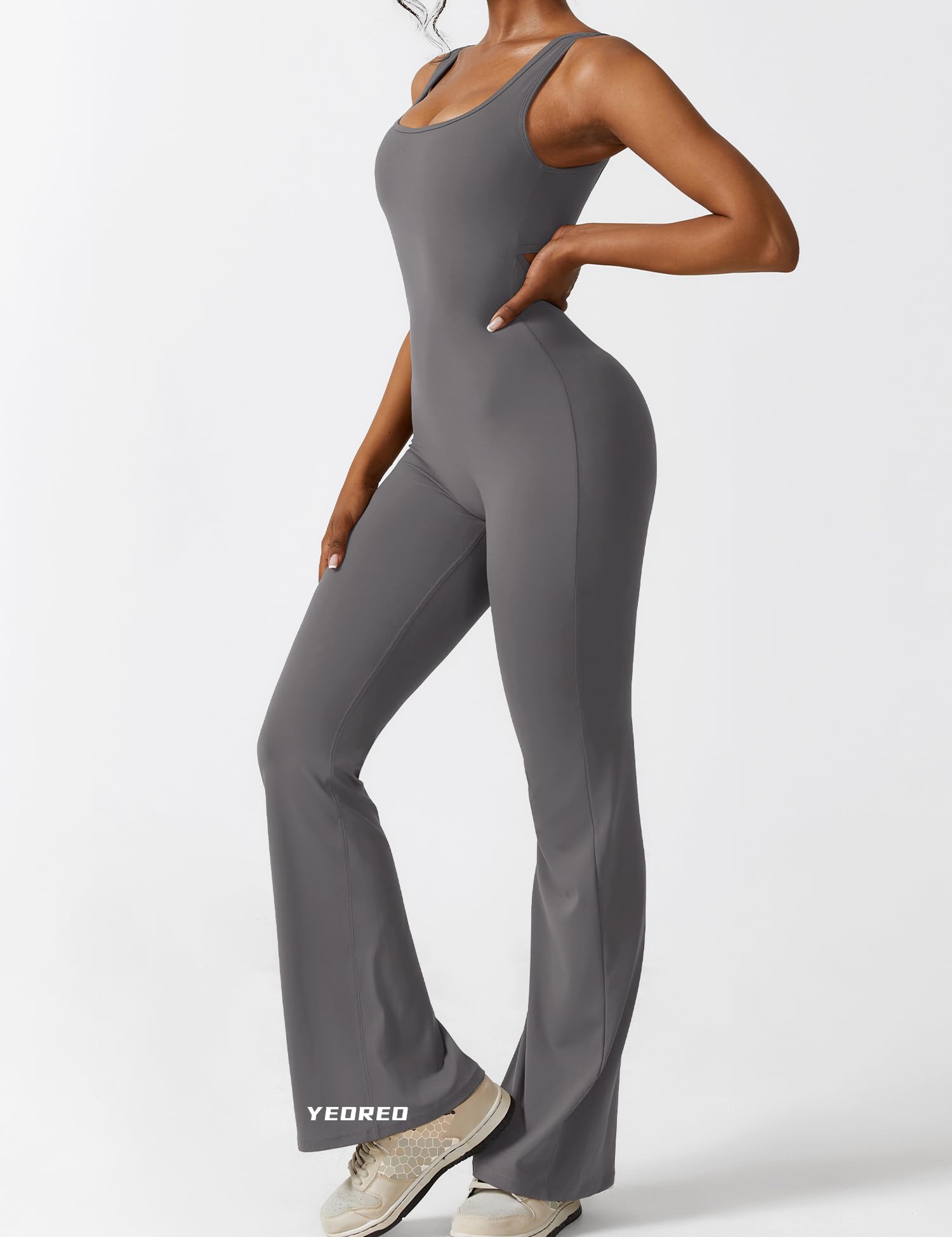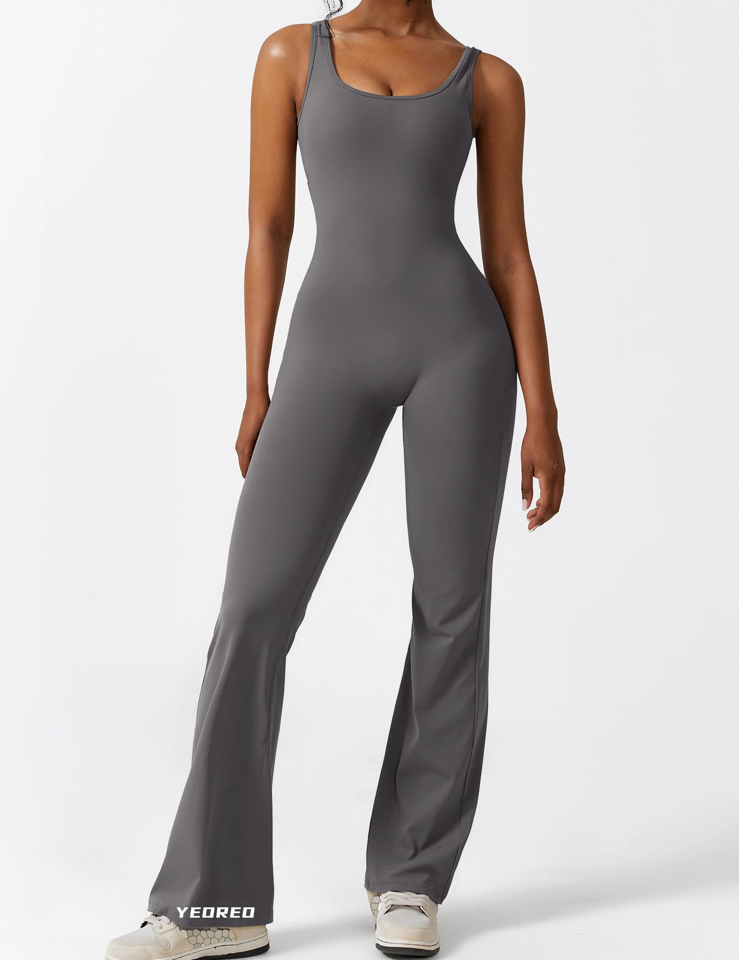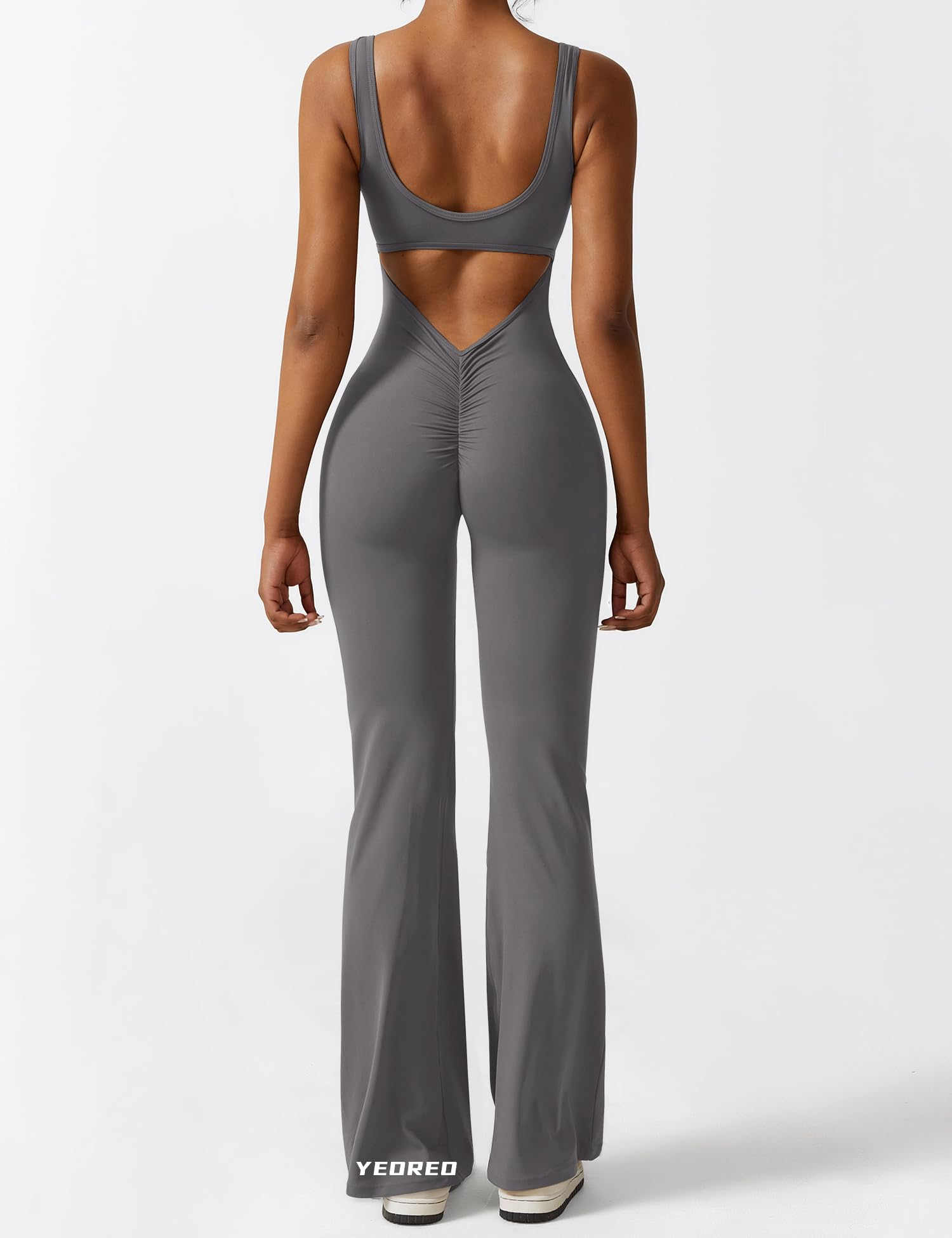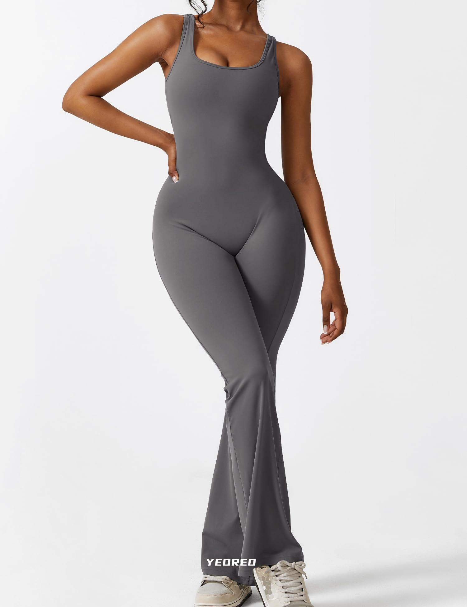 YEOREO Women Sleeveless Flare Jumpsuits Sexy Backless Gym Bodycon Scrunch Butt Yoga Rompers V Back Lizvette Dark Grey X-Small