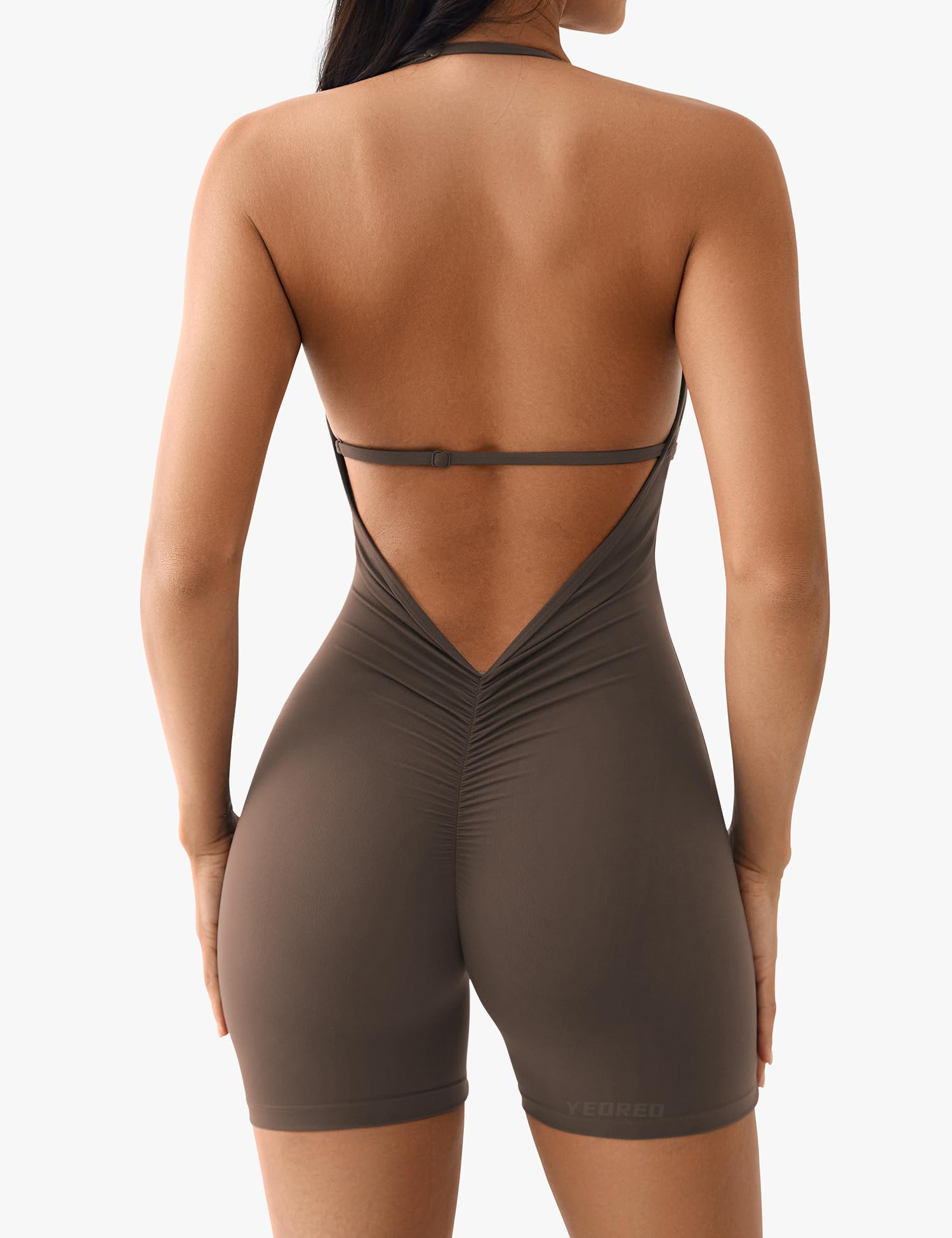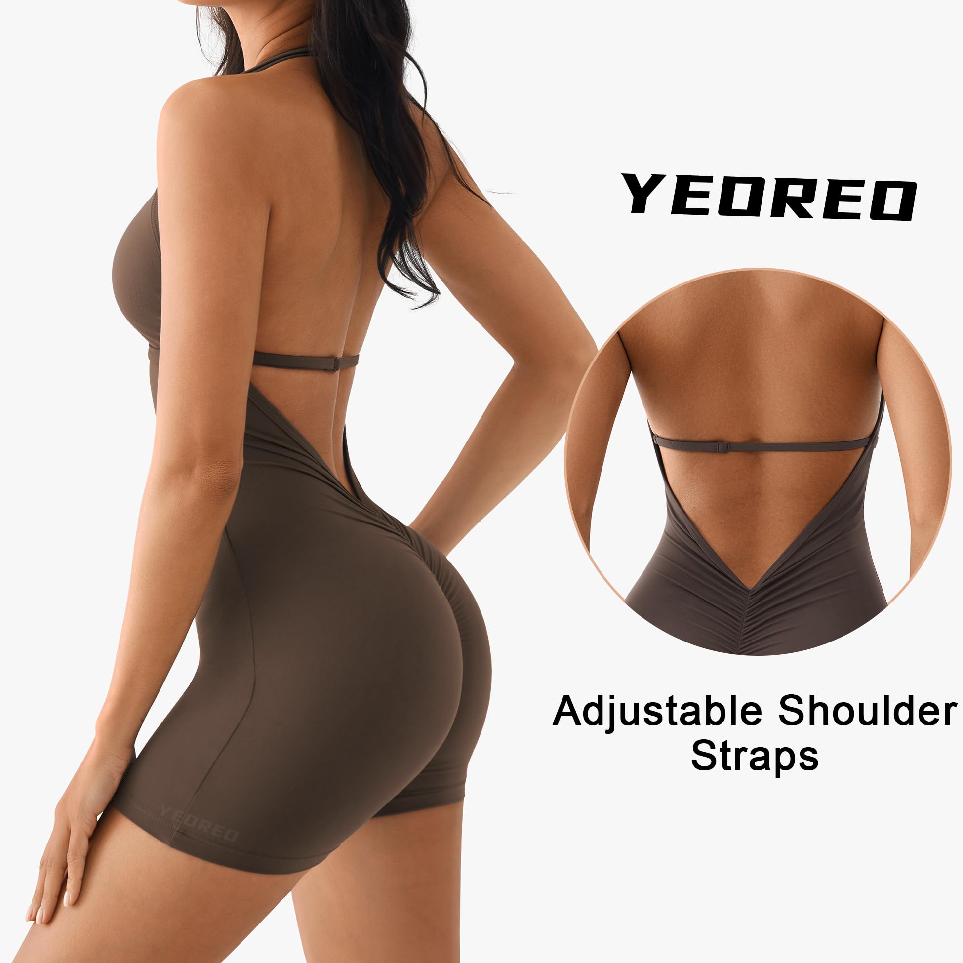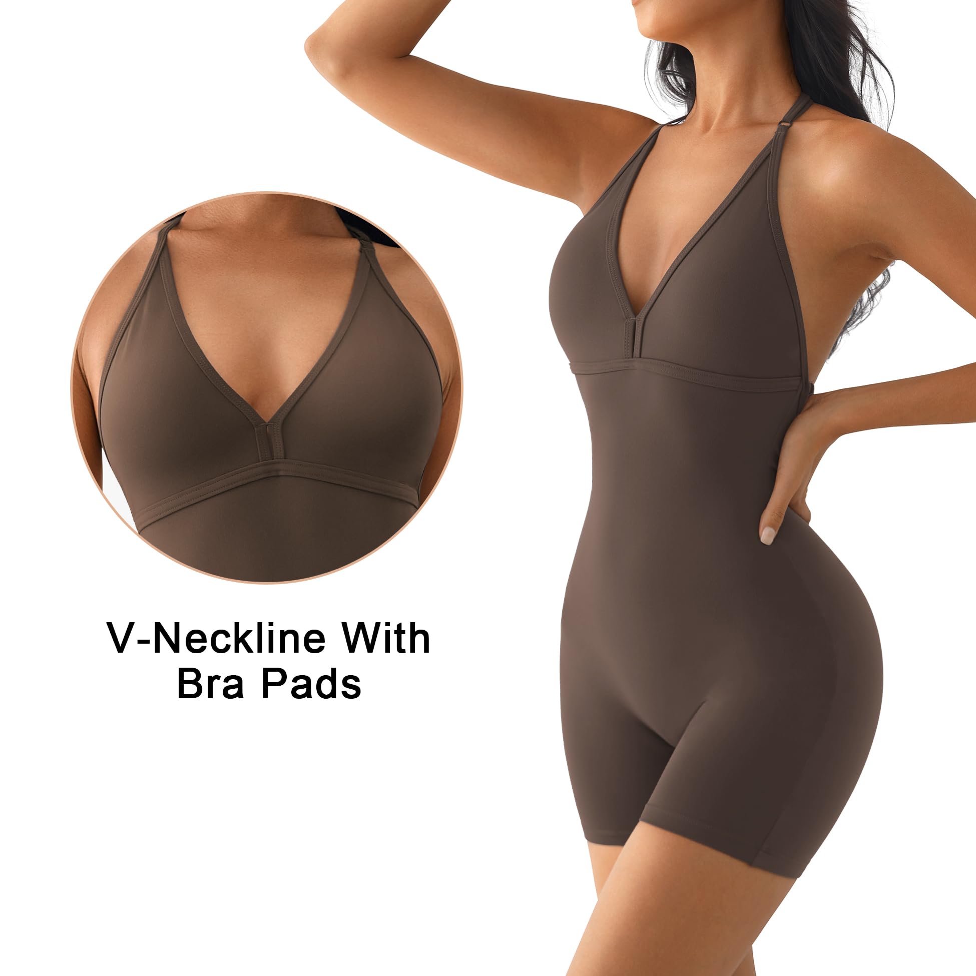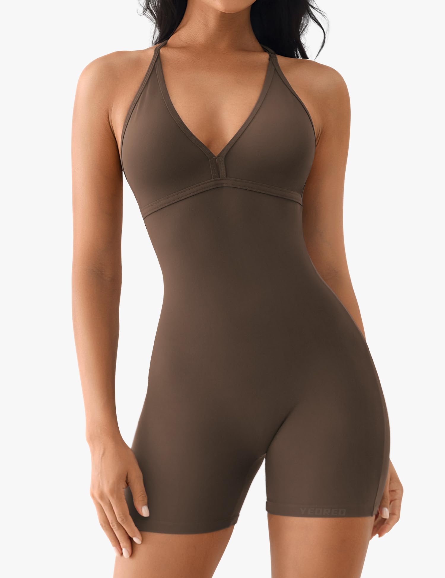 YEOREO Workout Jumpsuits For Women Tummy Control Short Rompers Taylor One Piece Jumpsuits V Neck Backless Bodysuit Women Coffee M