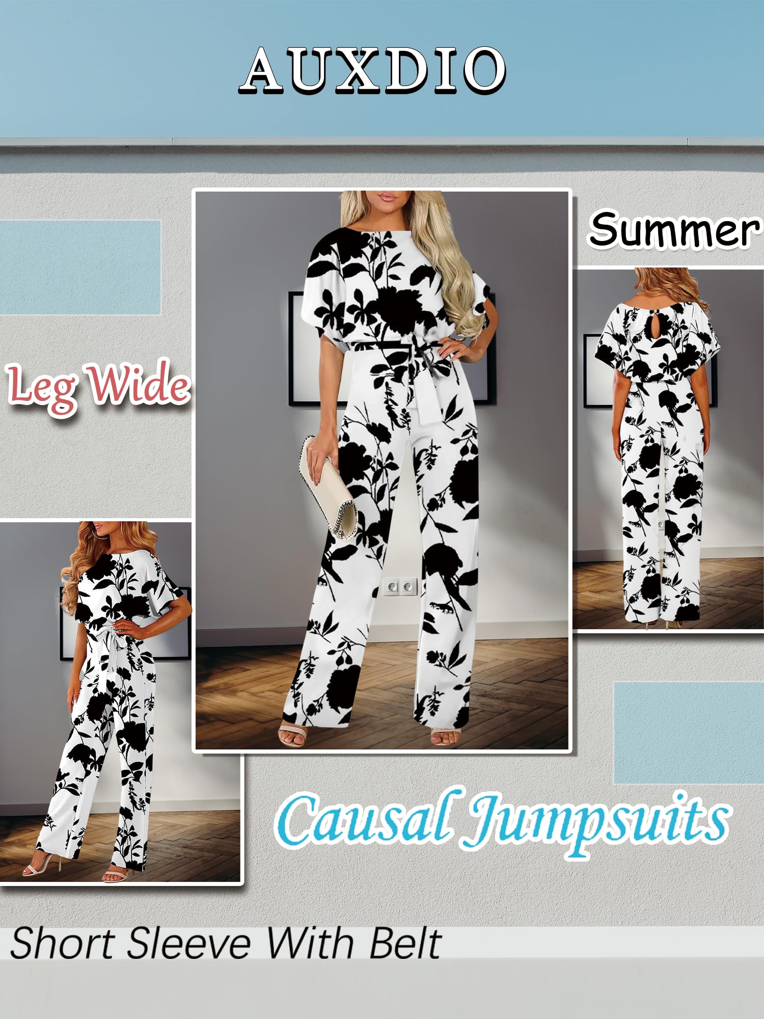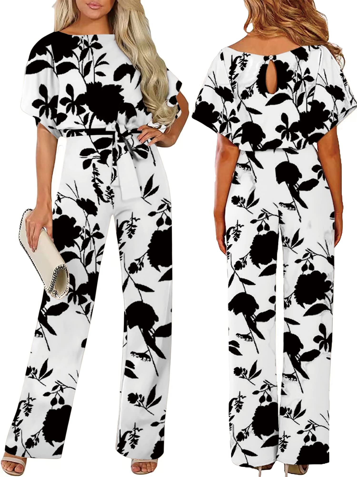 AUXDIO Womens Floral Print Jumpsuit Dressy Crew Neck Short Sleeve Tie Waist Wide Legs Pants Rompers Summer (Floral Print M)