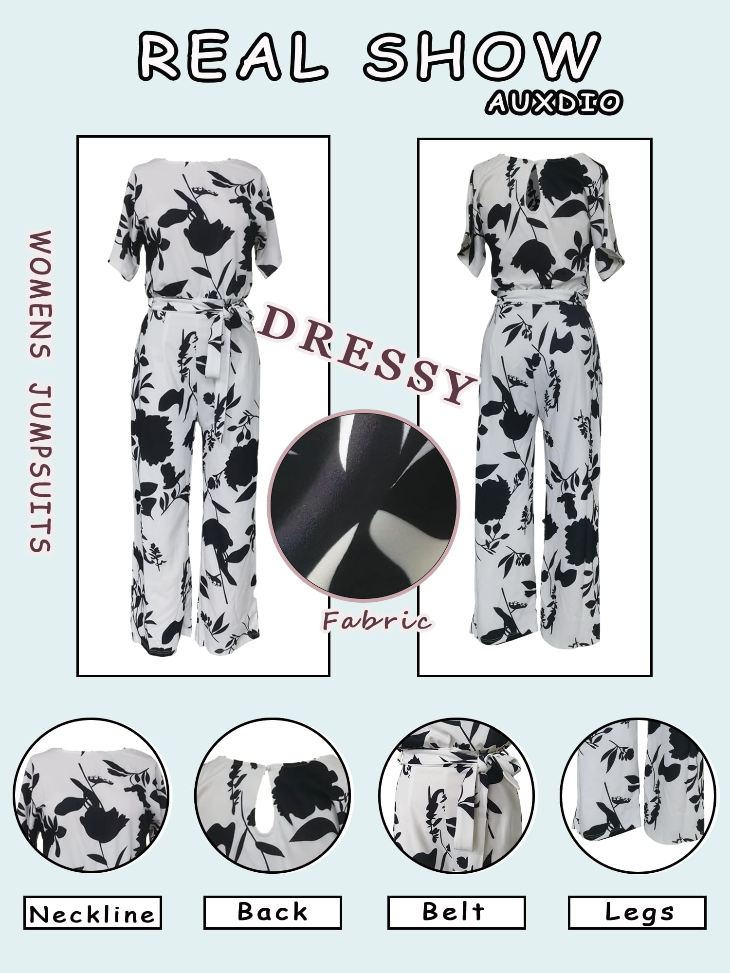 • Design:Solid color, round neck, short sleeves, single button back design, wide leg, long pants, high waist, belt type design, womens causal dressy jumpsuits.