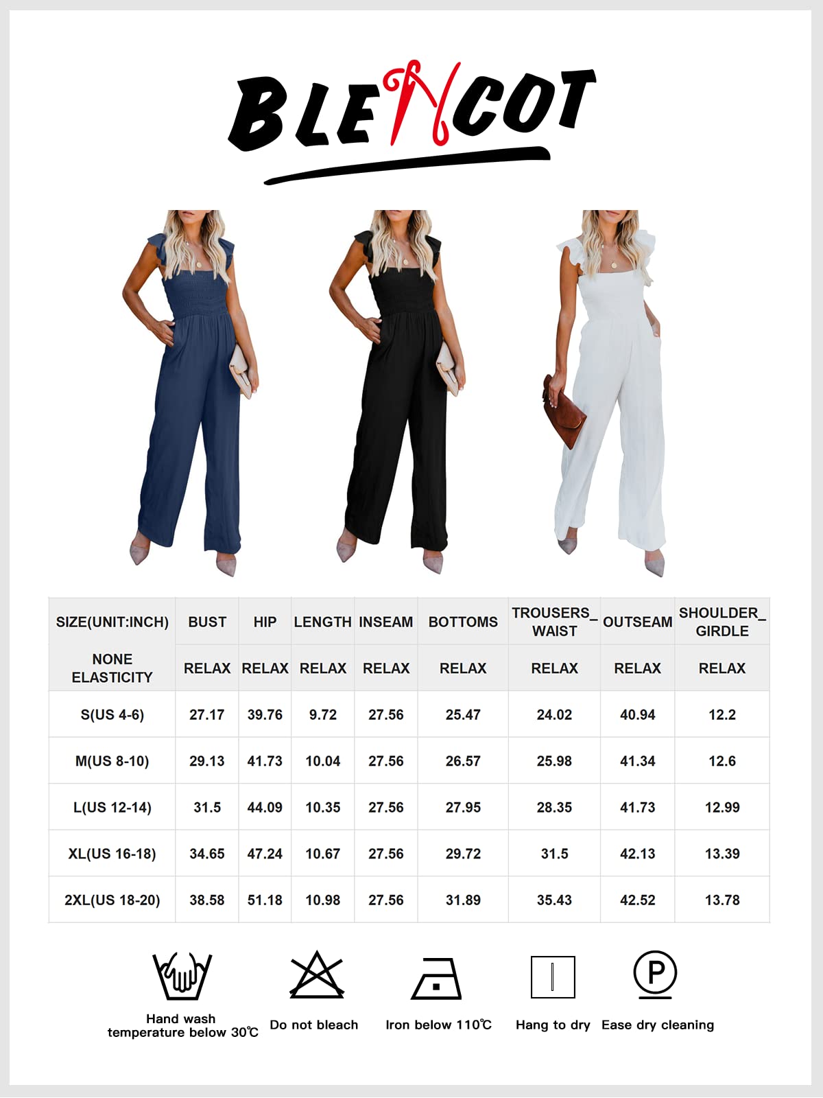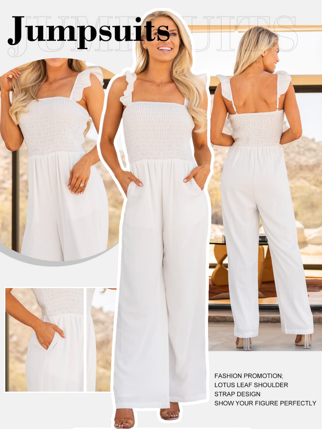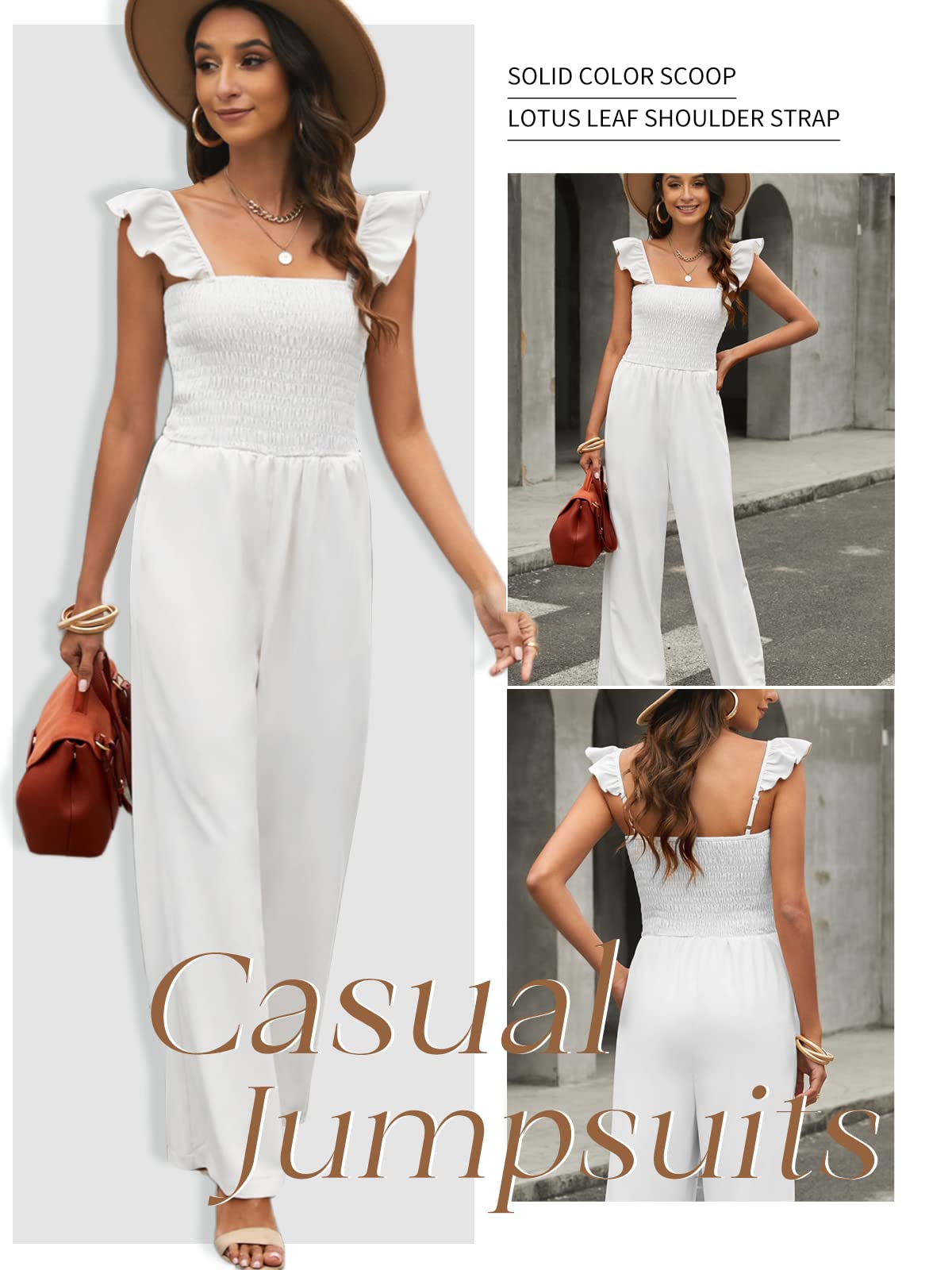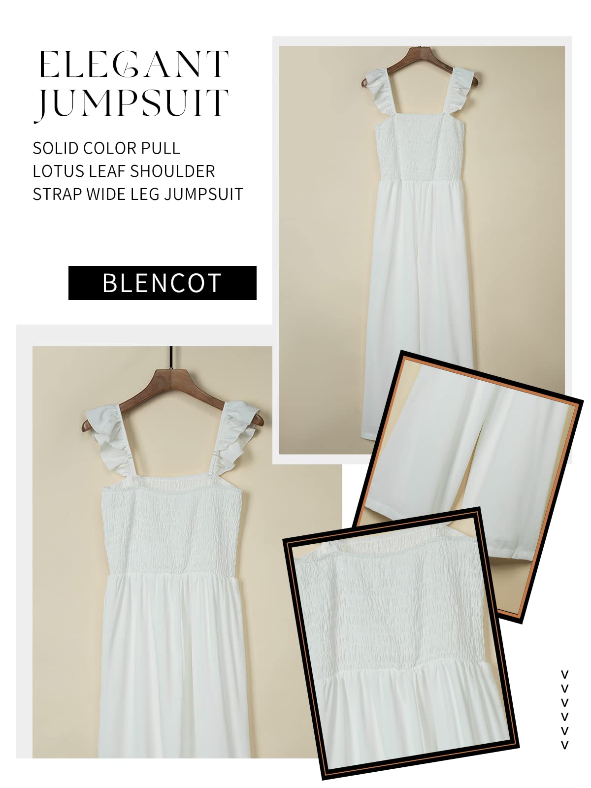 BLENCOT Womens Ruffle Spaghetti Straps High Waisted Long Wide Leg Jumpsuits Loose Sleeveless Rompers White Medium