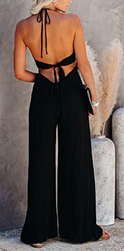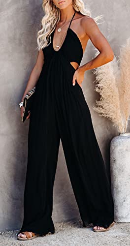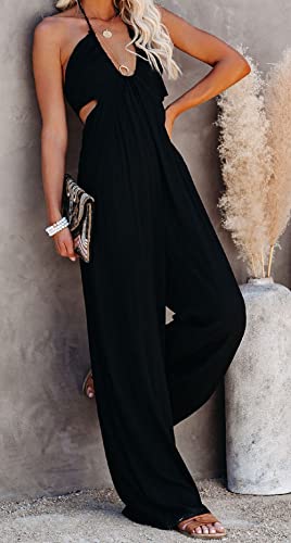 loveimgs Women's Sexy Deep Halter Neck Hollow Out Wide Leg Palazzo Pants Jumpsuit (Small, Black)