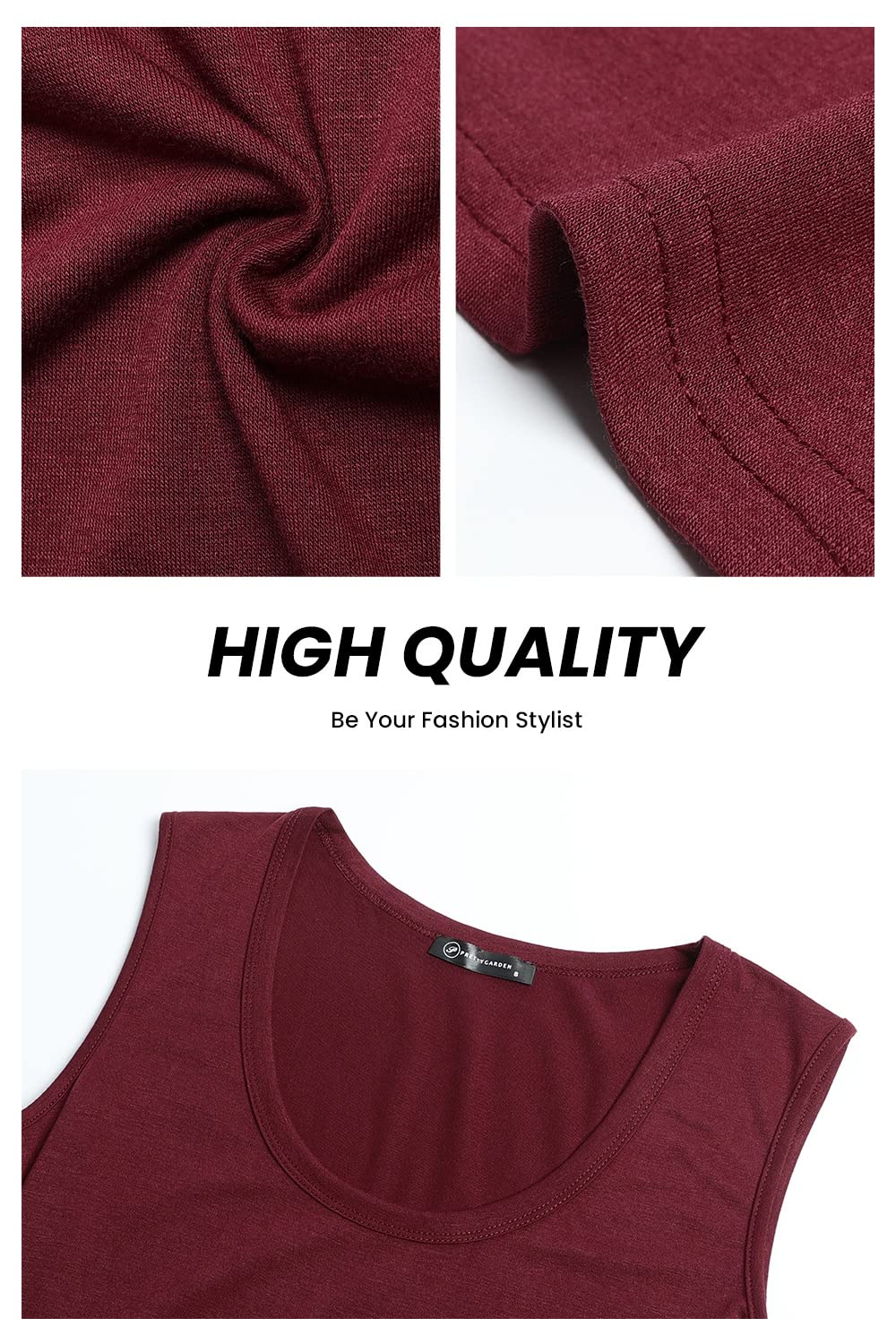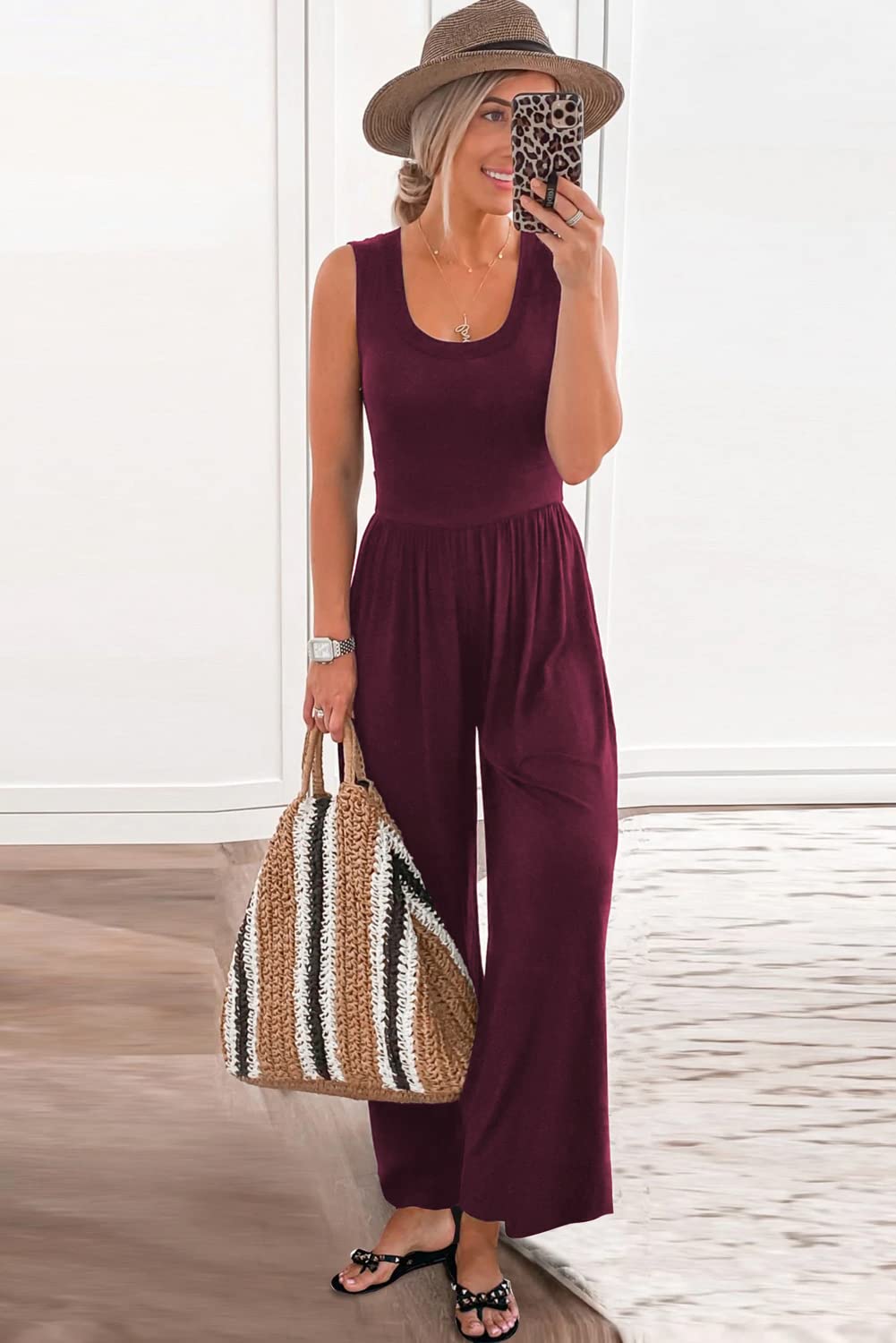 PRETTYGARDEN Women’s Summer Sleeveless Tank Jumpsuits High Waist Low Cut Casual Scoop Neck Fit And Flare Long Pants Rompers(Wine Red, Large)