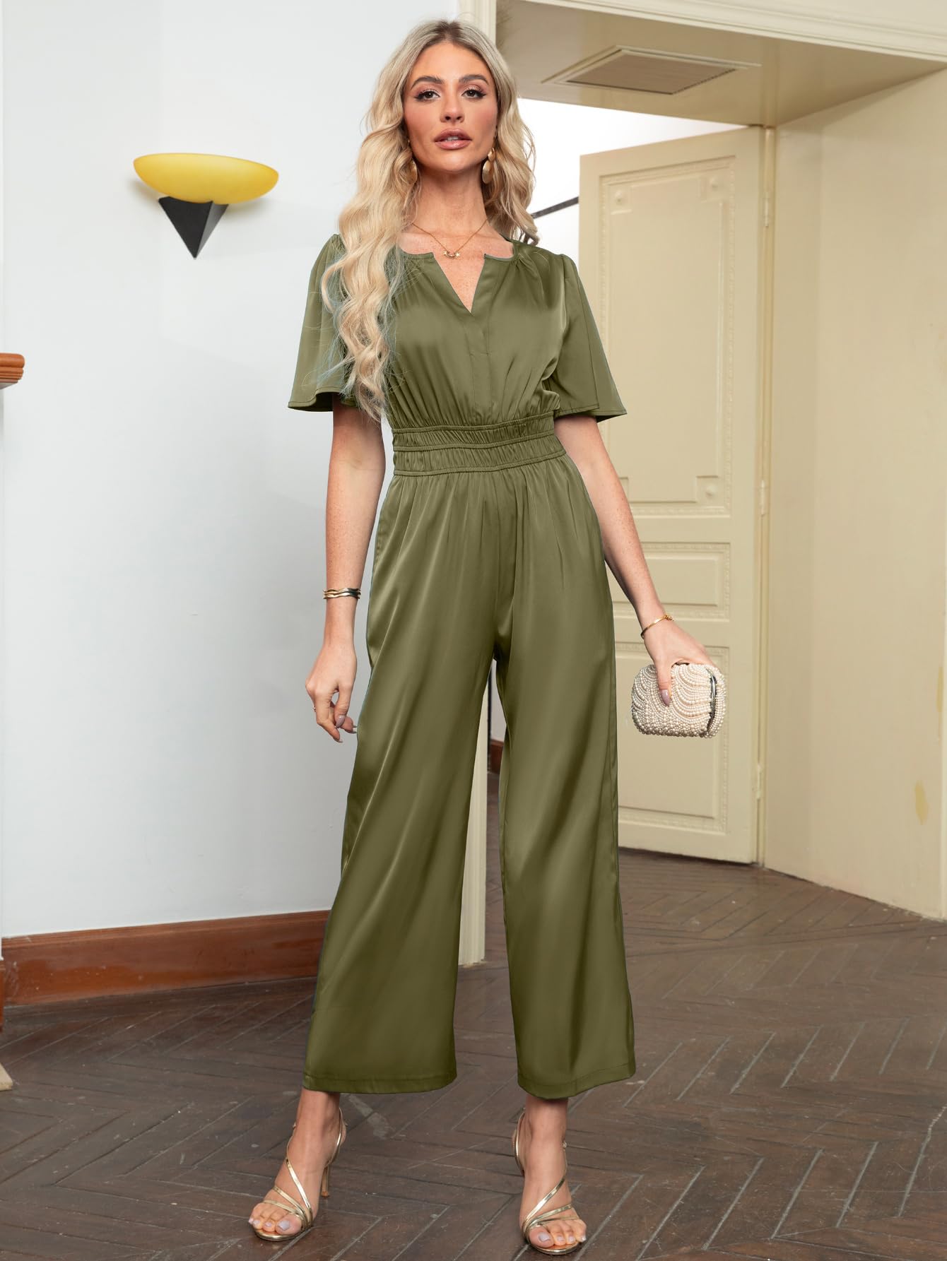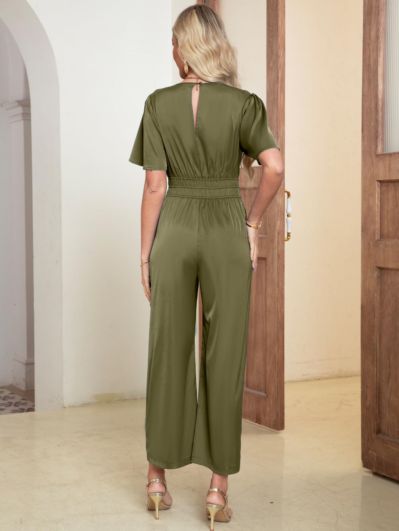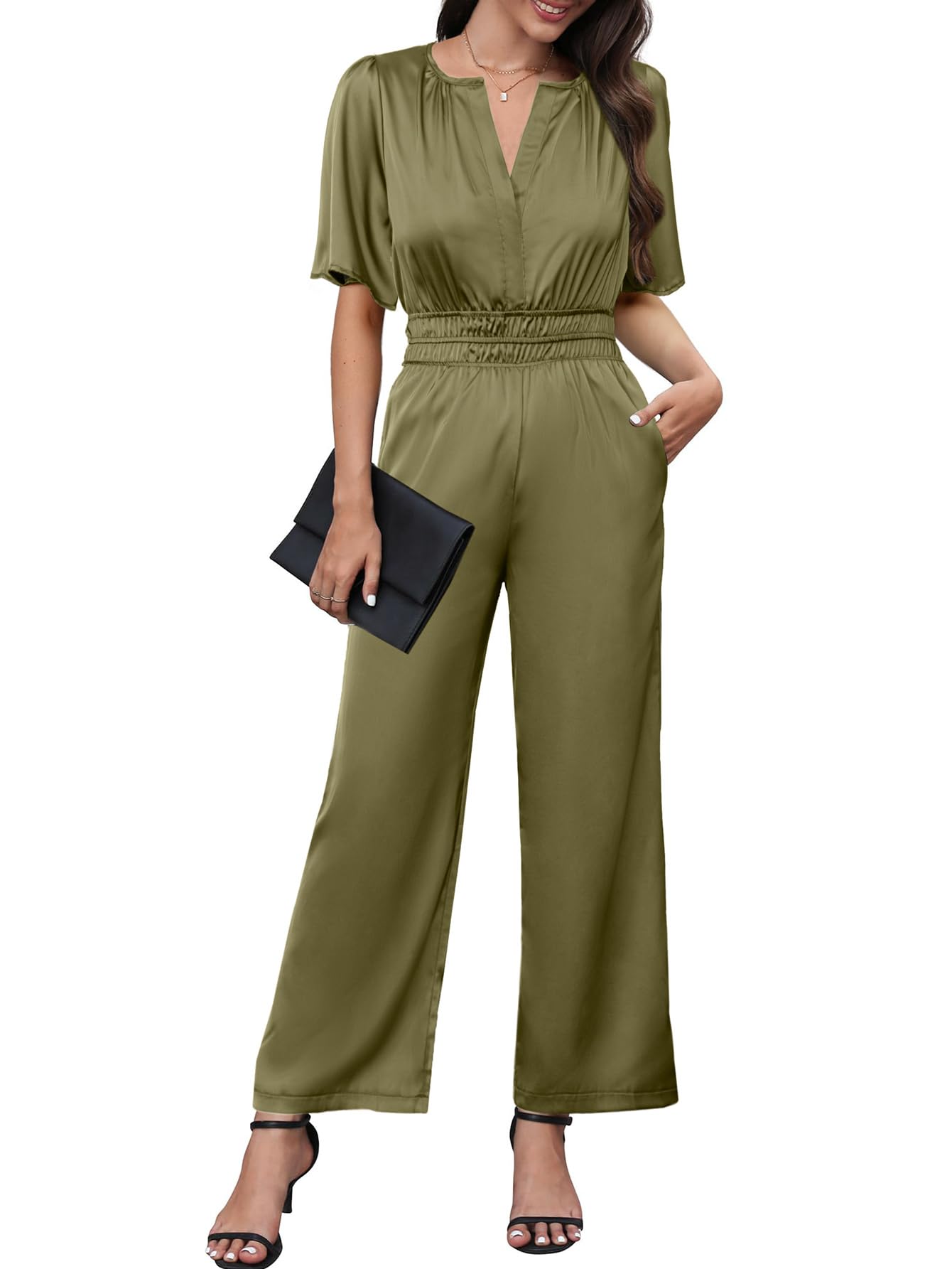 Simplee Jumpsuits For Women Casual Dressy Short Sleeve V Neck Empire Waist Satin Elegant Formal Jumpsuits For Wedding Guest (Olive Green L)