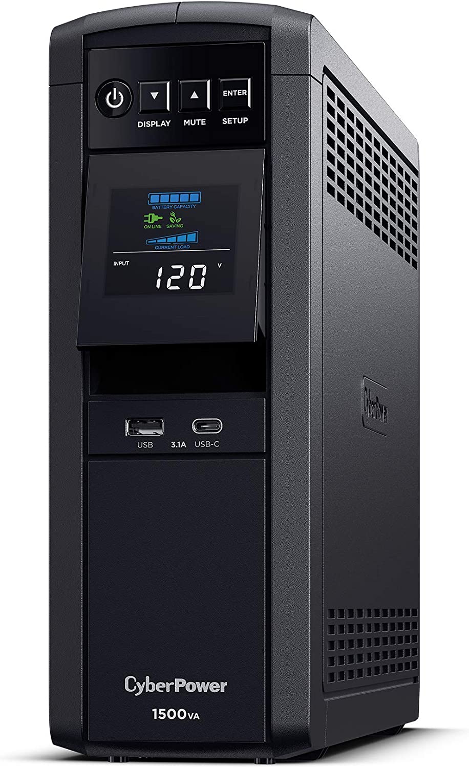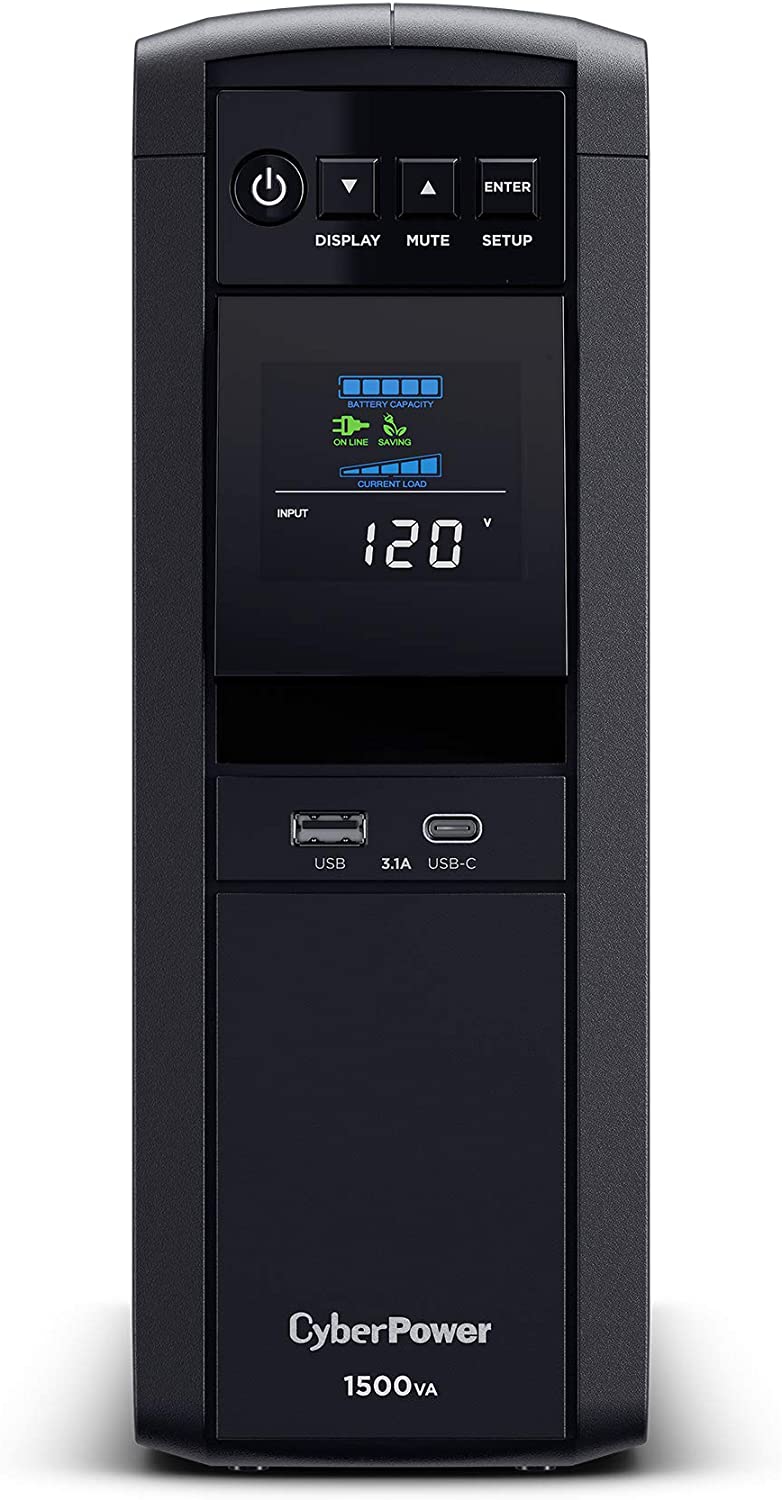 A mini-tower UPS with line interactive topology, the CyberPower PFC Sinewave CP1500PFCLCD provides battery backup (using sine wave output) and surge protection for desktop computers, workstations, networking devices, and home entertainment systems requiring active PFC power source compatibility. The CP1500PFCLCD features an advanced multifunction control panel with a color LCD to quickly confirm status and alerts at-a-glance. The screen tilts for easy viewing when the UPS is placed in a low position such as under a desk. Two USB charge ports (one Type-A and one Type-C) power portable devices such as mobile phones and tablets, even during a utility power failure. The CP1500PFCLCD uses Automatic Voltage Regulation (AVR) to correct minor power fluctuations without switching to battery power, which extends battery life. AVR is essential in areas where power fluctuations occur frequently. The CP1500PFCLCD comes with a three-year warranty (including coverage of batteries) and a $500,000 Connected Equipment Guarantee.