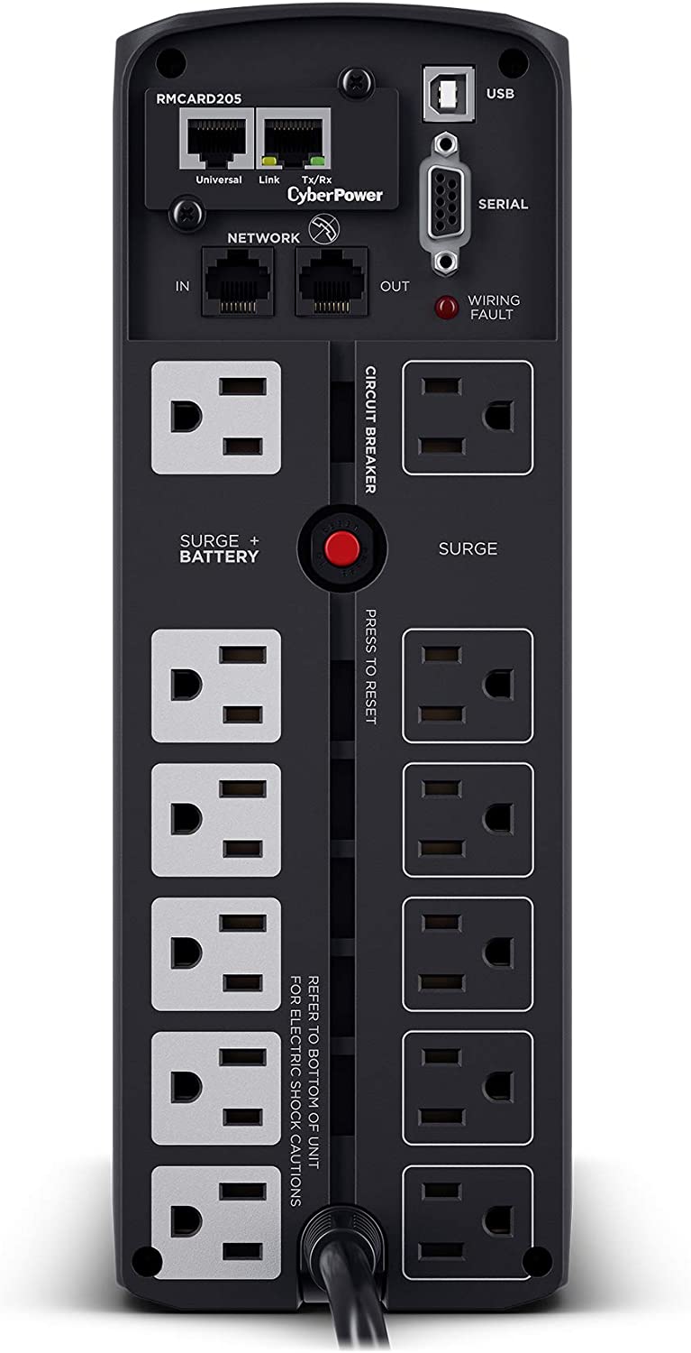 • 12 NEMA 5-15R OUTLETS: Six battery backup & surge protected outlets, six surge protected outlets; INPUT: NEMA 5-15P right angle, 45 degree offset plug with five foot power cord; 2 USB charge ports (1 Type-A, 1 Type-C) quickly charges mobile phones and tablets
