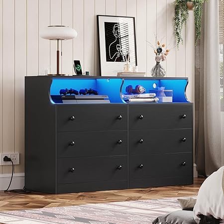 DICTAC LED Dresser for Bedroom, 6 Drawer Double Dresser with Charging Station, Chest of Drawers with Open Storage, Modern Storage Organizer Unit for Bedroom, Closet, Living Room, Black