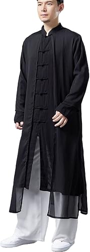 Men's Trench Coat Long Printed Tang Suit Kung Fu Cotton Linen Robe Chinese Style Fake Two Piece Jackets (MF-2009 Black, XL)