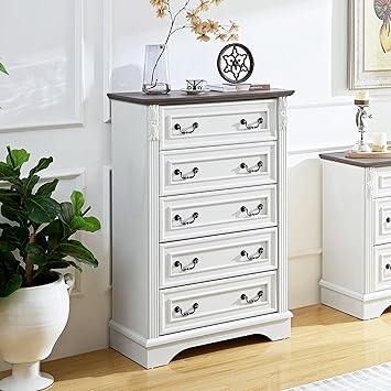 Modern 5 Drawer Dresser, Dresser for Bedroom, Wood Rustic Tall Chset of Drawers with Carved Wood Pilasters, Farmhouse Dressers Organizer for Bedroom, Hallway, Antique White