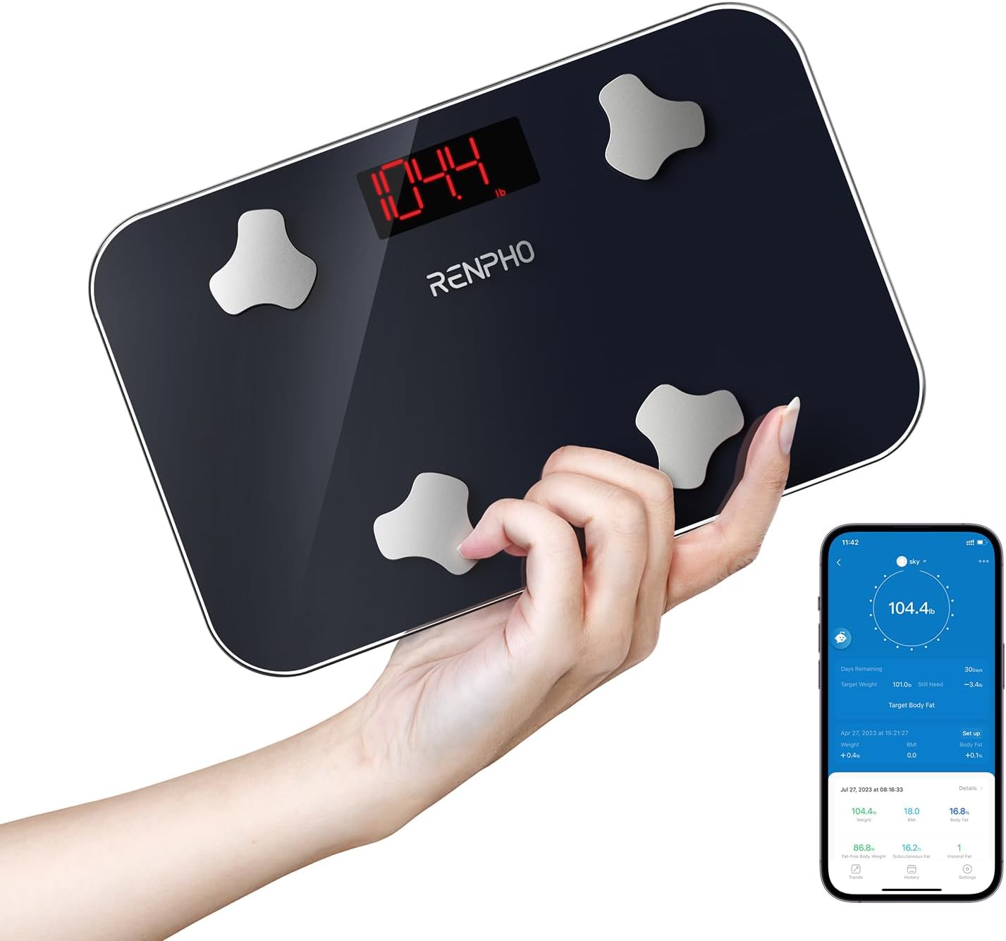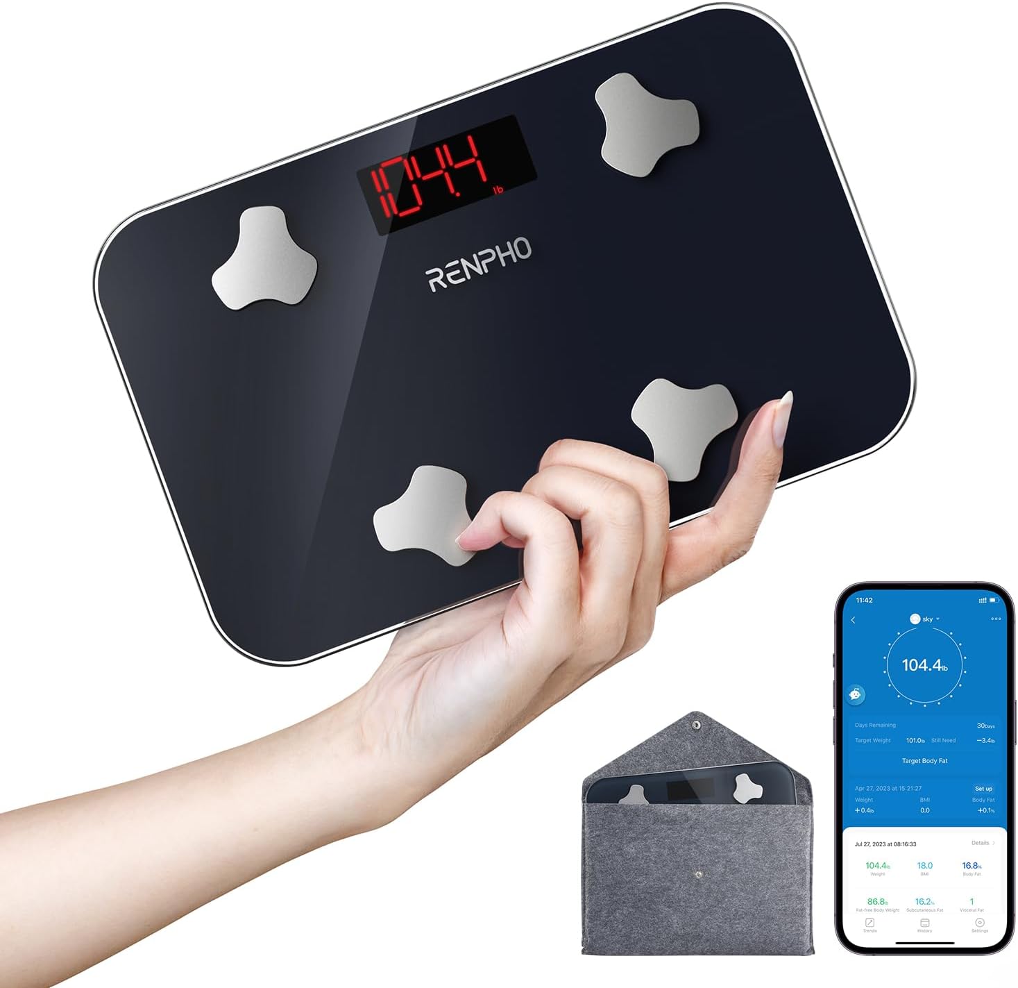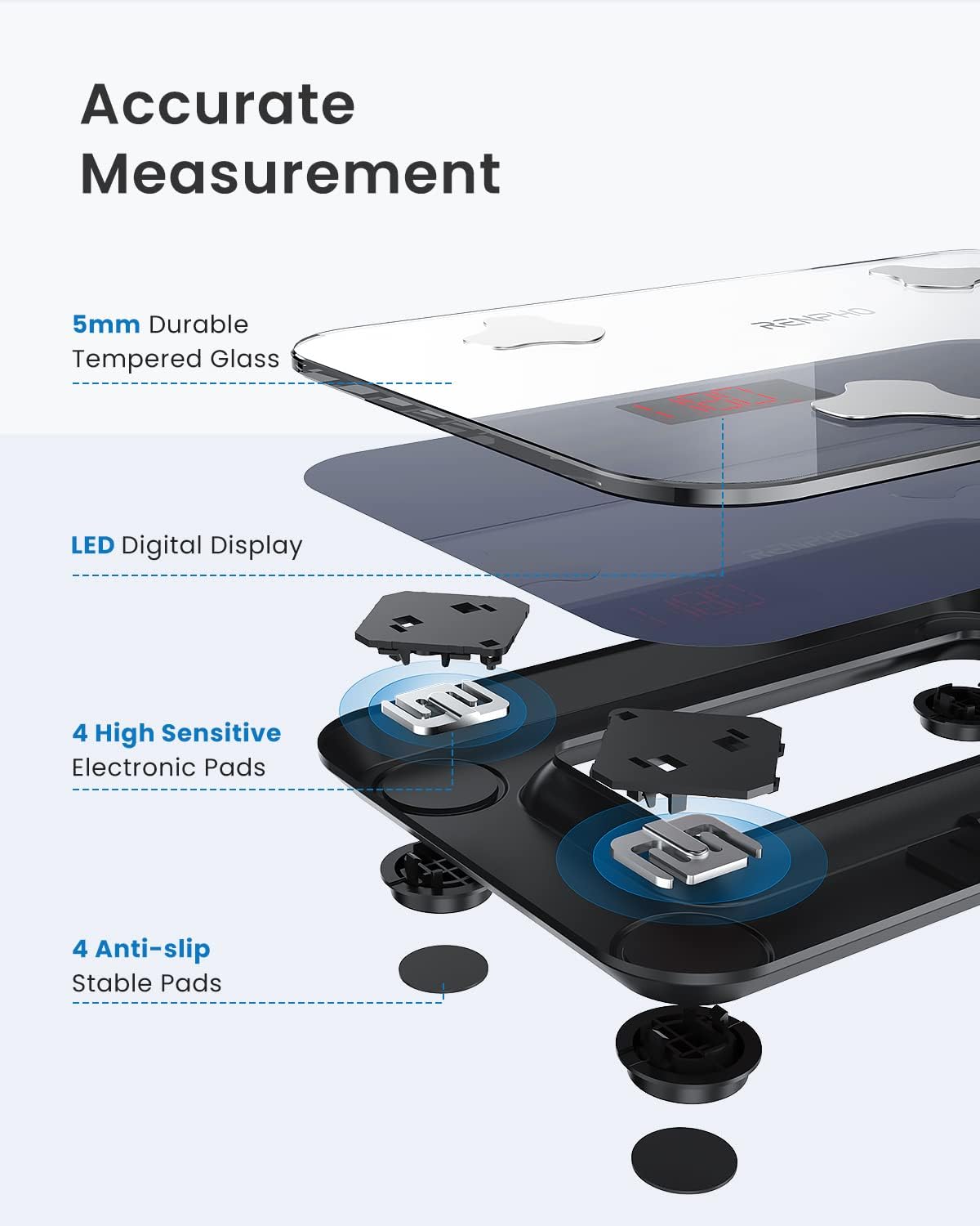 • 13 Key Health Metrics: Renpho Health app features 13 essential body composition evaluation that calculates your BMI and monitors changes in muscles, body fat, water, bones, and more. Our premium Bluetooth Digital Bathroom Scale gives you a full picture of your body.