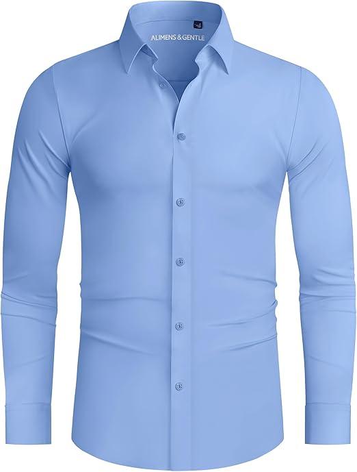 Alimens & Gentle Men's Dress Shirts 16-Way Stretch Slim Fit Long Sleeve Button Down Shirts Wrinkle Free Traveler Shirts Classic Blue