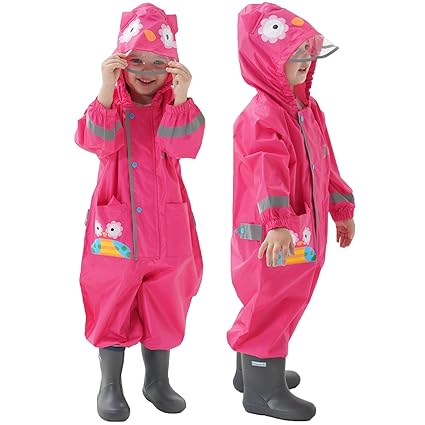 Kids Toddler Rain Suit for Boys Girls One Piece Hoodie Zipper Cute Cartoon Owl Waterproof Rain Jacket 5-7 Years L Size