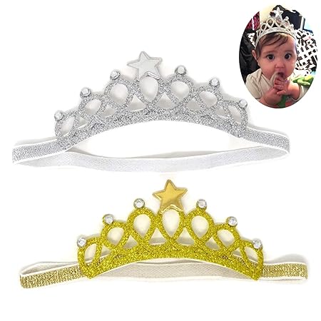 Honbay 2PCS Baby Hair Accessories Baby Princess Crown Headband with Crystal and Star for 1 to 3 Years Old Baby, Gold and Silver