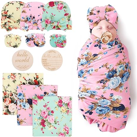 DRESHOW BQUBO Floral Swaddles for Baby Girl Newborn Receiving Blanket with Bow Hat Mittens Wooden Birth Announcement Card Set Baby Floral Print Swaddle Nursery Swaddle Wrap