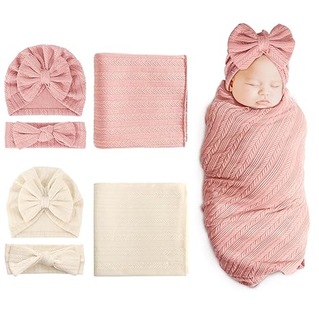 DRESHOW BQUBO Newborn Receiving Blanket Headband Hat Set for Baby, Unisex Baby Boys Girls Essentials, Newborn Registry Must Haves, Stroller Crib Shower Gifts