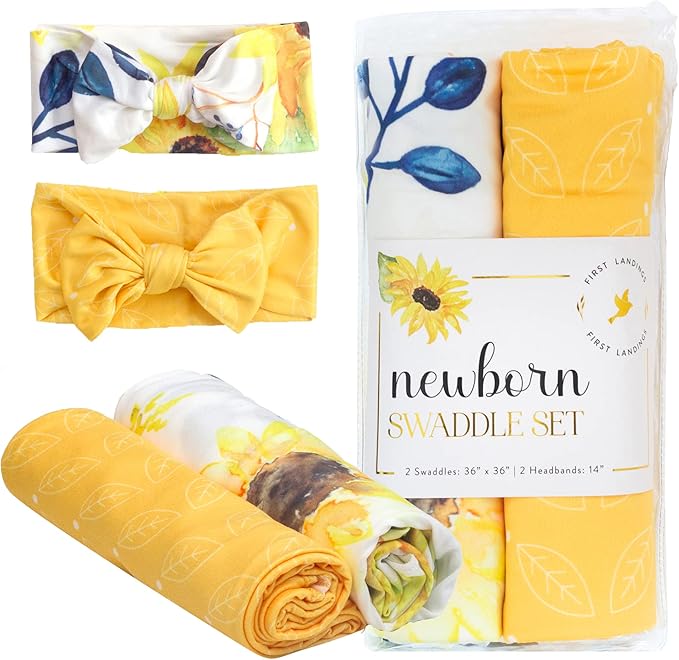 First Landings Newborn Swaddle Set - Matching Headband and Baby Blanket (Set of 2 Each) 36" x 36" Receiving Baby Blanket Boy and Girl - For Newborn Photography, Nursing Covers, Burp Cloths (Sunflower)