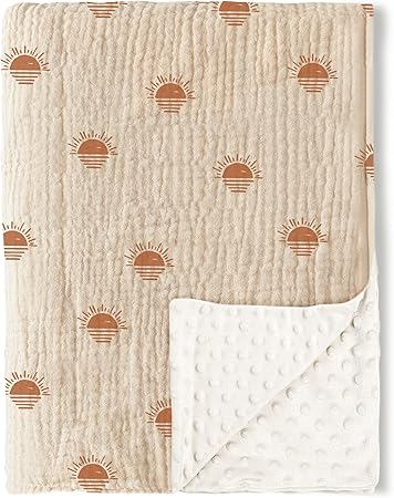 Konssy Baby Blankets for Unisex Boys Girls, Super Soft Nursery Minky Blankets with Muslin Cotton Front and Dotted Fleece Backing, Printed Bed Throws Newborn