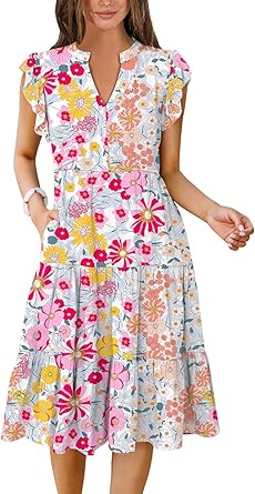 ANRABESS Womens Summer Ruffle Sleeve V Neck Midi Dress 2024 Fashion Casual Fit Flowy Tiered Boho Beach Vacation Sundress
