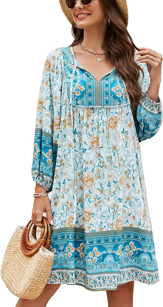 Bluetime Women Casual Summer Dress Boho V Neck 3/4 Sleeve Short Babydoll Floral Print Flowy Beach Dresses