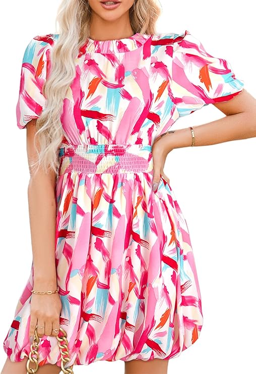 Dokotoo Womens Boho Dresses Crewneck Puff Sleeve Tie Back Smocked Empire Waist Beach Floral Mini Dresses