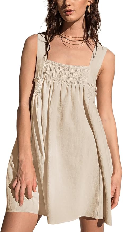 Fisoew Women 's Summer Casual Sleeveless Mini Dress Square Neck Smocked Swing Loose Babydoll Dress