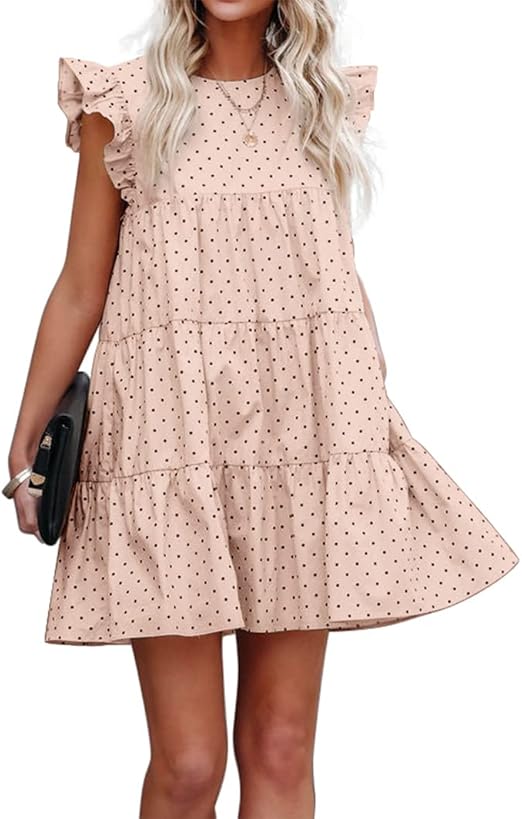 FSHAOES Women Casual Babydoll Mini Dress Ruffle Sleeve Polka Dot A-line Tiered Tunic Dress