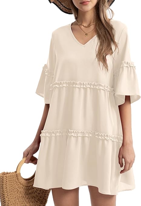 Funlingo Women's Summer Dresses Flowy Tunic Mini Dress Short Sleeve V Neck Swing Dress Casual knee Length Dress