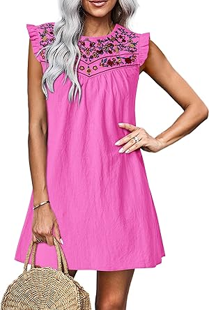 KIRUNDO Women's 2024 Casual Summer Sleeveless Boho Floral Embroidered Mini Dress Loose Babydoll Short Shift Dresses,
