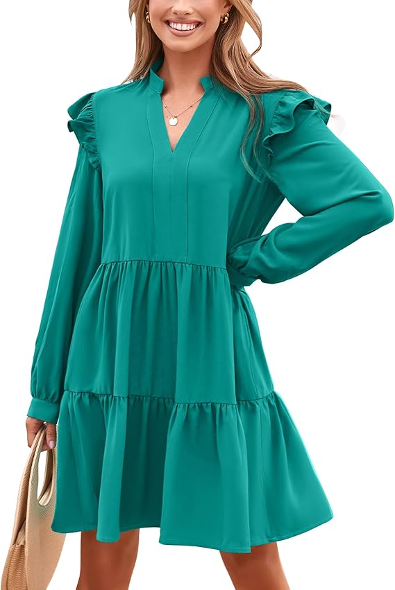 KIRUNDO Women's 2024 Spring Fall Casual Ruffle Long Sleeve V Neck Mini Dress Loose Tiered Babydoll Dresses with Pockets
