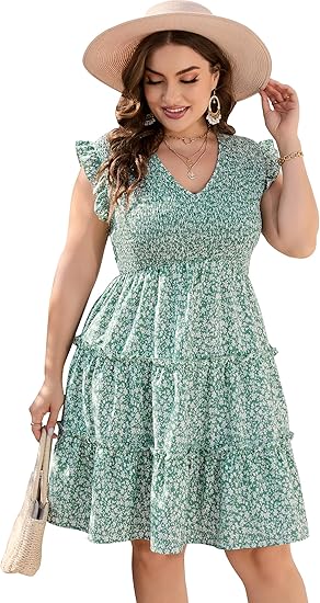 KOJOOIN Plus Size Sleeveless Summer Dress for Women Ruffle Short Sleeve Smocked Dress V Neck Babydoll Midi Dress